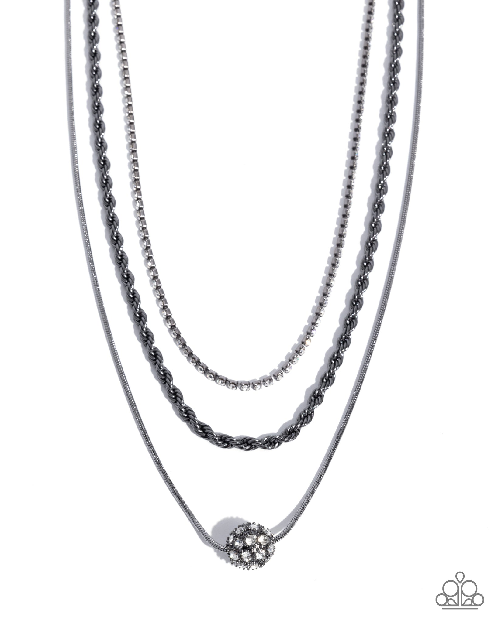 Three mismatched strands of white rhinestones in gunmetal square fittings, a gunmetal rope chain, and a gunmetal snake chain coalesce below the neckline in tiers for a heartstopping haute display. A white rhinestone-dusted gunmetal ornament glides along the lowermost chain for additional shimmer. Features an adjustable clasp closure.