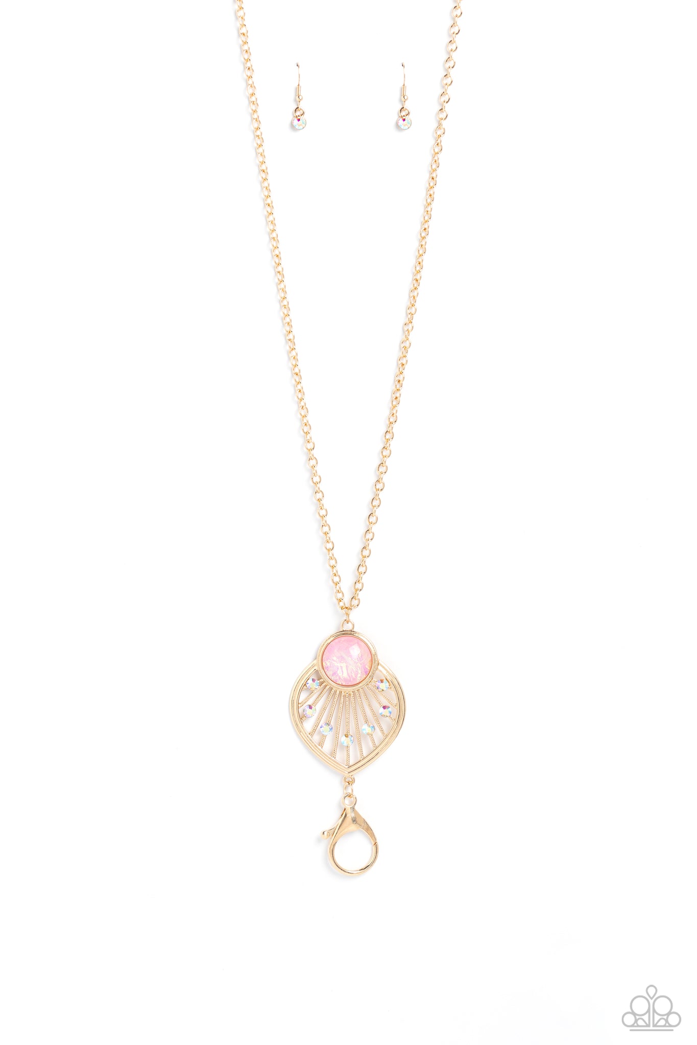 Featuring a refracted shimmer and an opalescent finish, a pink bead decorates the front of an oversized spade-shaped gold frame radiating with studded linear textures and iridescent rhinestones for a celestial-inspired look. A lobster clasp hangs from the bottom of the design to allow a name badge or other item to be attached. Features an adjustable clasp closure. Due to its prismatic palette, color may vary.