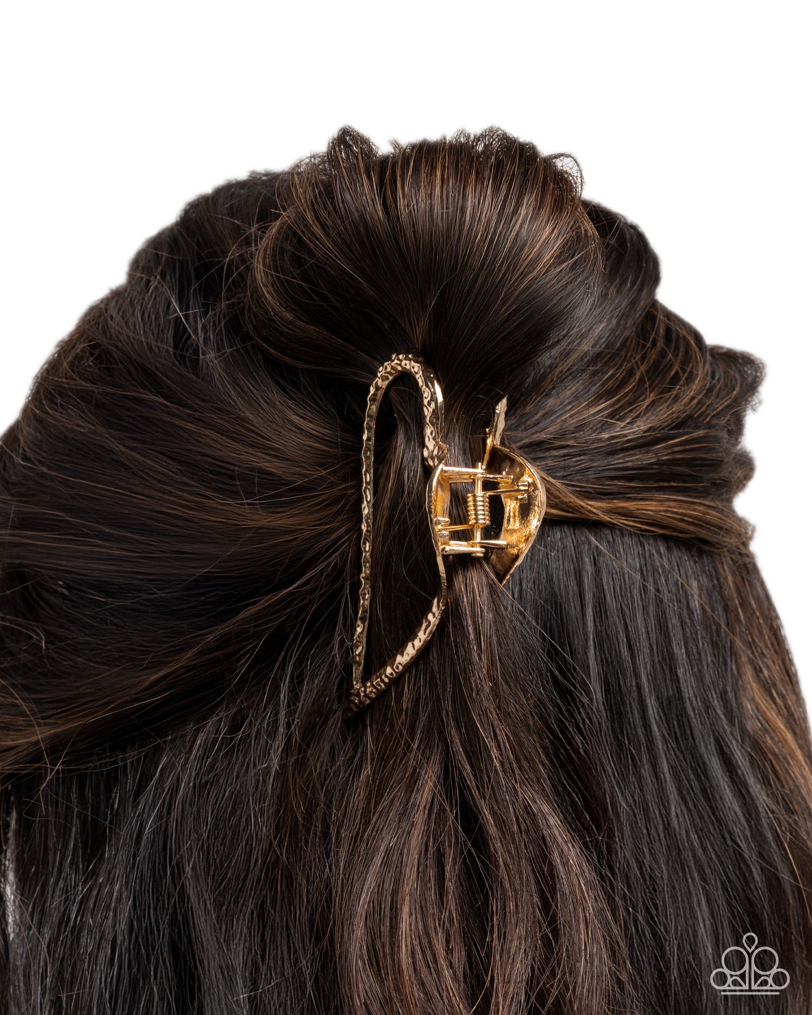 Featuring a hammered effect, this gold heart claw clip holds the hair away from the face for an on-the-go rustically romantic display. Clip measures approximately 3" in length and 1 3/4" in width.