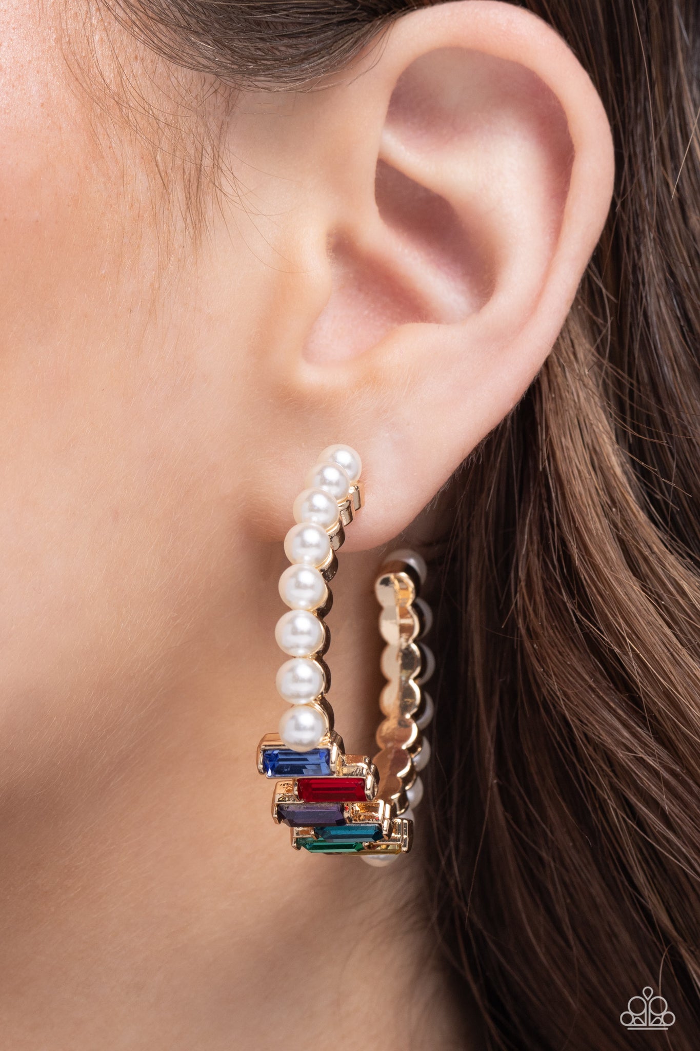 Floating atop sleek gold fittings, a glamorous collection of classic white pearls, interrupted by a collection of staggered multicolored emerald-cut gems, delicately coalesces around a gold hoop for a sparkly statement. Earring attaches to a standard post fitting. Hoop measures approximately 1 3/4" in diameter.
