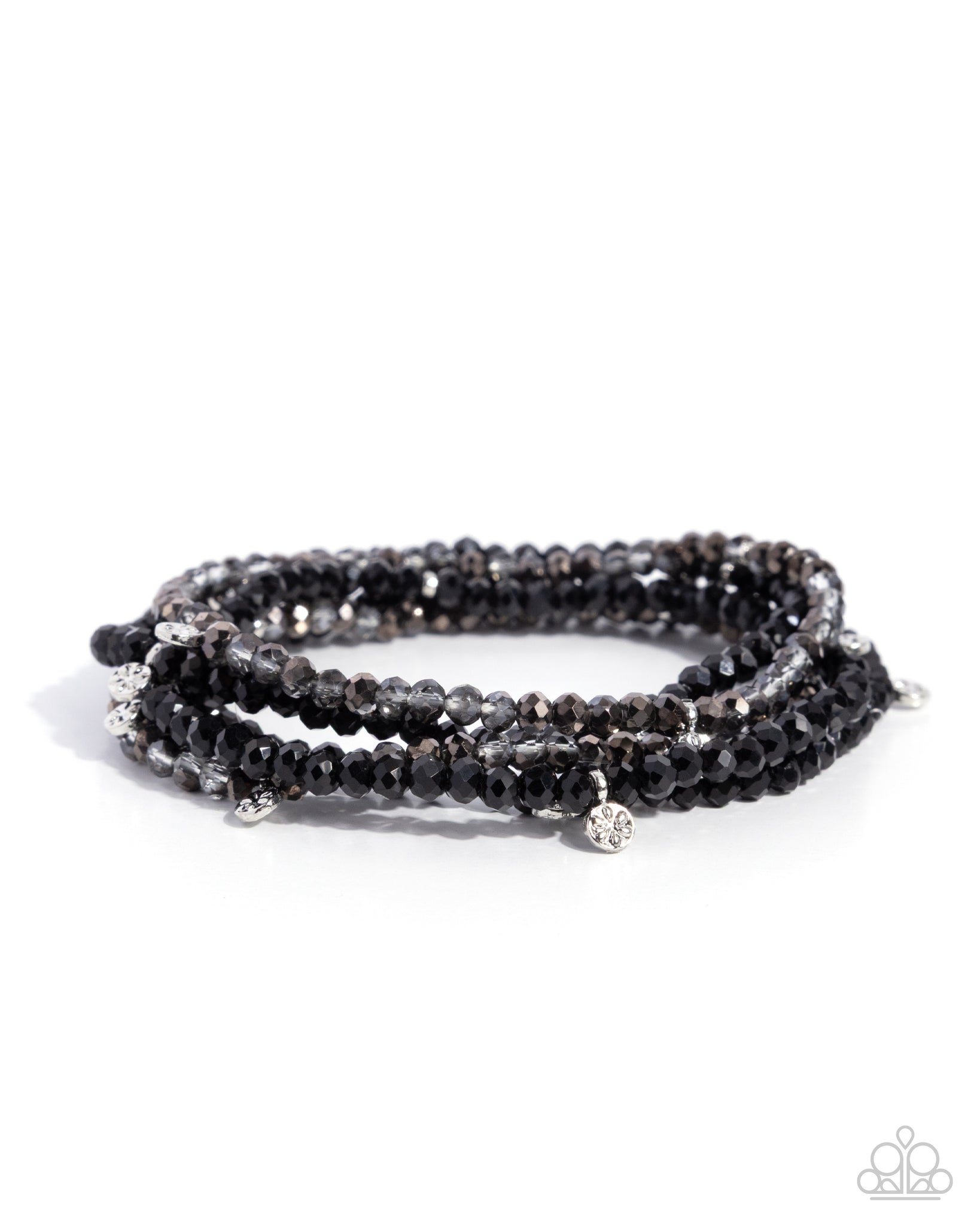 Dainty transparent and milky black beads join silver floral-textured discs along elastic stretchy bands, creating radiantly refined layers across the wrist.