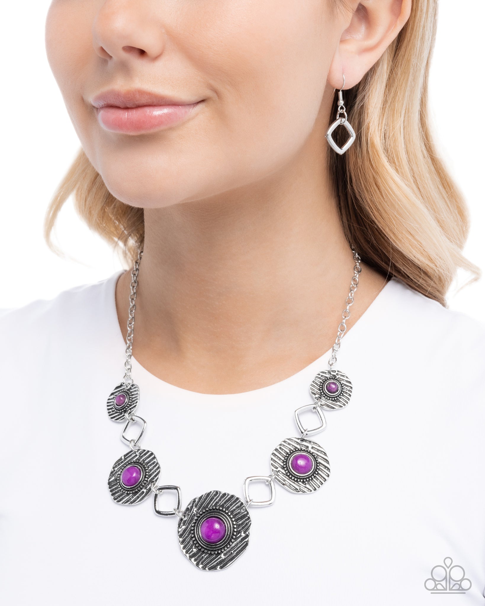 Suspended from a dainty silver chain, textured silver discs featuring bold purple stone accents, link together by airy silver square frames. The intricate patterns and bright pops of color combine for a stylish and artistic design. Features an adjustable clasp closure. As the stone elements in this piece are natural, some color variation is normal.
