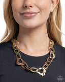 Oversized brass links connect with hammered gold triangular frames, creating a dramatic two-tone chain below the collar. The contrasting metals and high-sheen finishes lend a bold, industrial flair. Features an adjustable clasp closure.