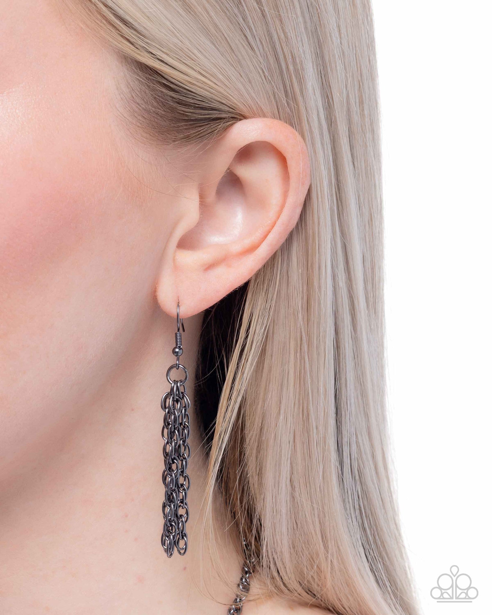 Interconnected gunmetal rings link together, forming a bold chain along the neckline. A textured gunmetal pendant featuring concentric circles swings from the center, creating a modern statement. Features an adjustable clasp closure.