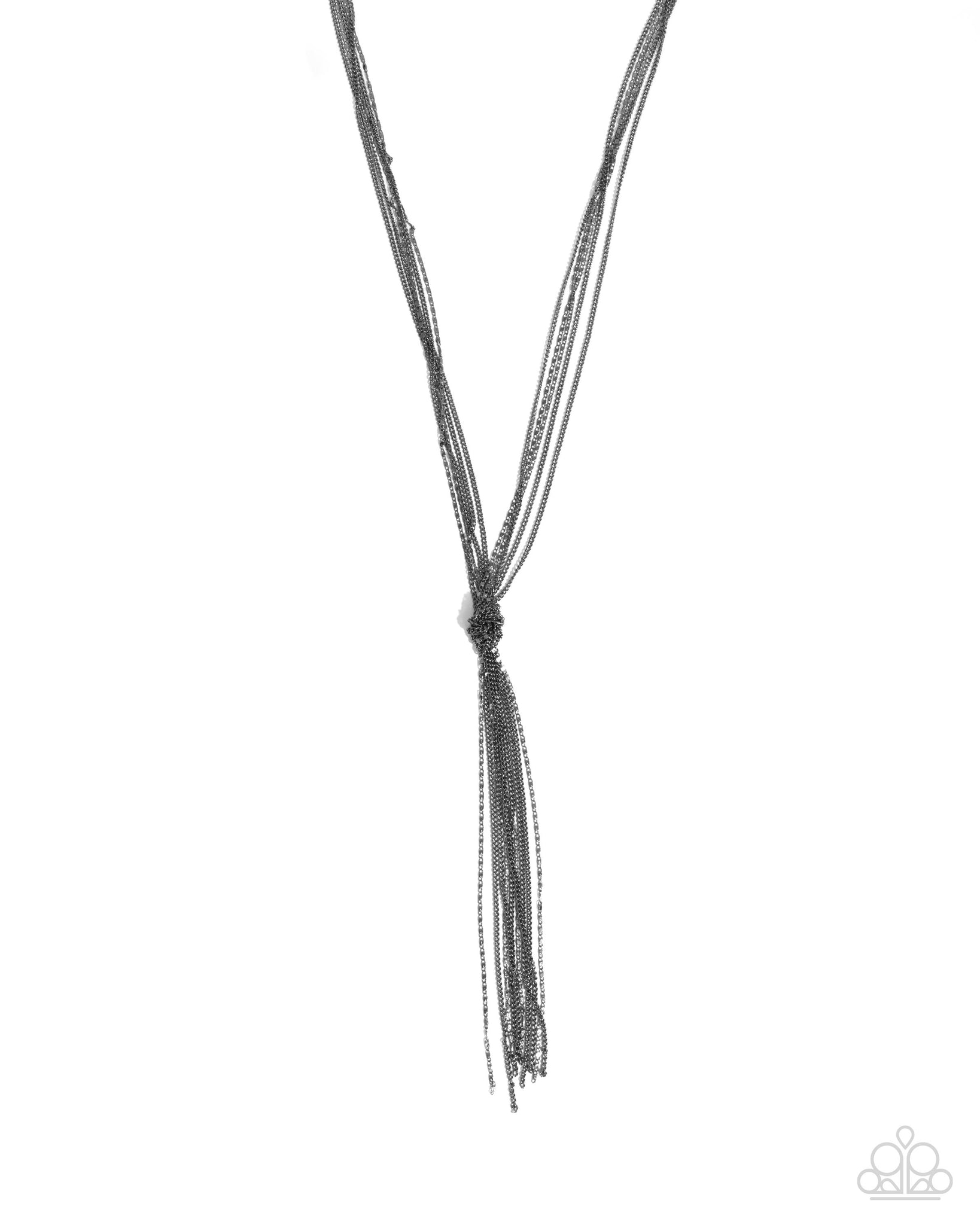 A collection of gunmetal chains intertwines into a knotted design at the base, creating a sleek and modern tassel-like necklace. The cascading strands of chain add movement and a chic edge to the overall look. Features an adjustable clasp closure.