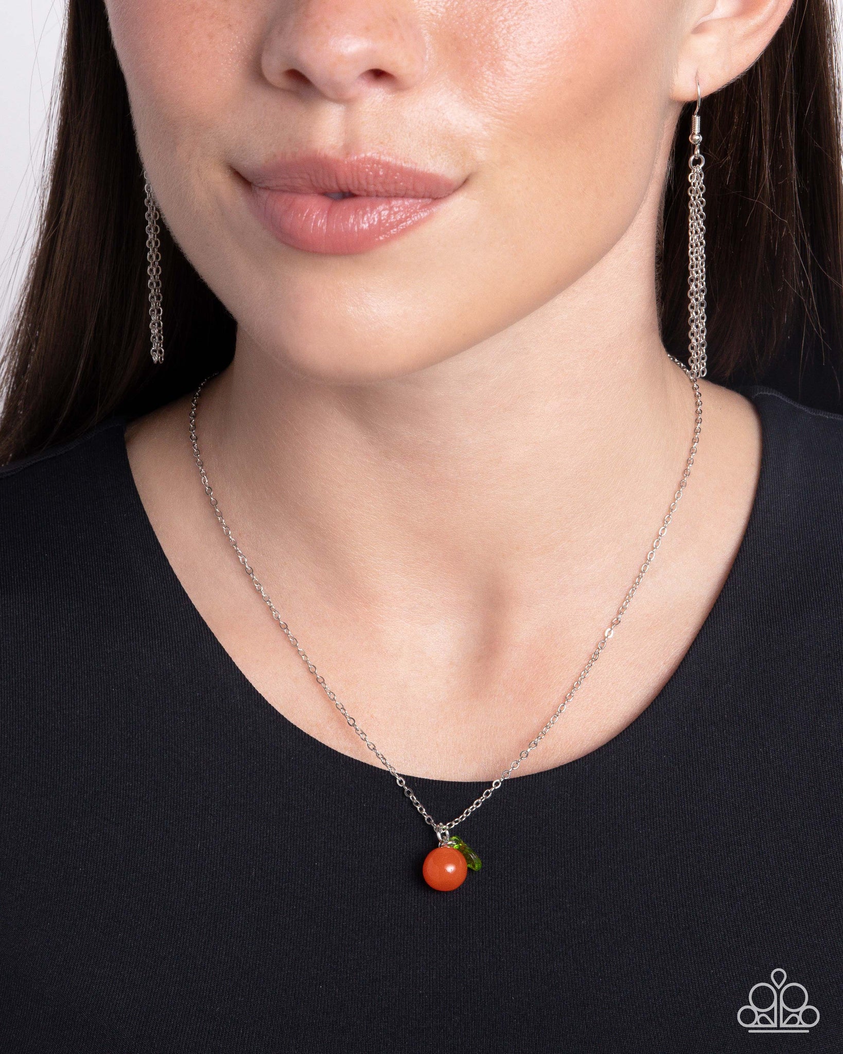 Gliding along a dainty silver chain, a glossy orange charm with a faceted green gem leaf glimmers below the neckline for a fantastically fruity design. Features an adjustable clasp closure.
