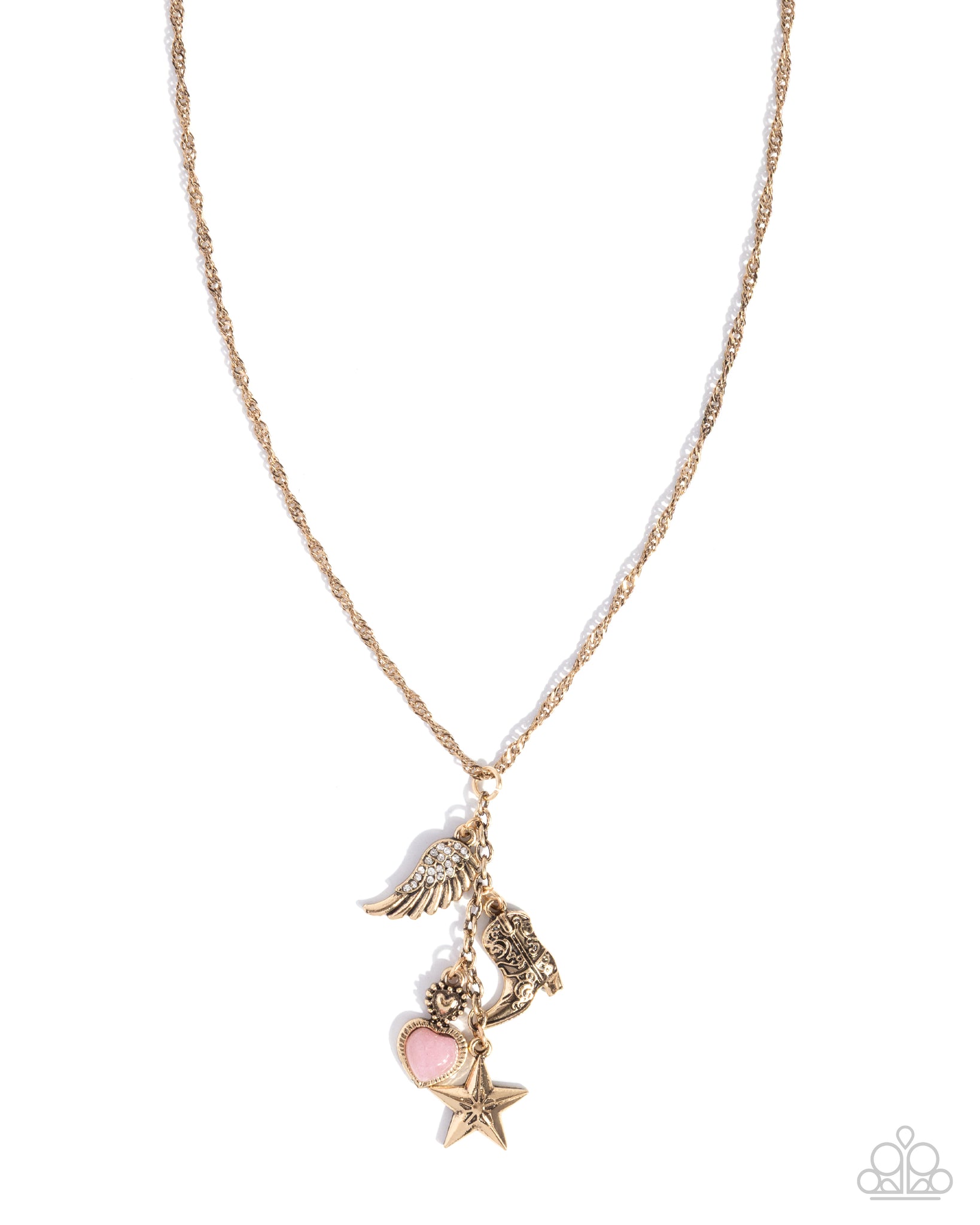 Gliding along an extended singapore gold chain, a collection of Western-inspired charms including a white rhinestone-embellished half-angel wing, a three-dimensional sheriff star, a detailed cowboy boot, and a gold-studded heart that gives way to a rose quartz stone heart, cascades below the chest for a chic display. Features an adjustable clasp closure. As the stone elements in this piece are natural, some color variation is normal.