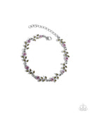 BRACELET: Personal Estate • Red P9RE-RDXX-175GN: Dotted with dainty light red rhinestone centers, red iridescent rhinestone-petaled silver flowers delicately link around the wrist for an ethereal fashion. Duos of dainty olive rhinestones dot the leaves for additional whimsical detail. Features an adjustable clasp closure. Due to its prismatic palette, color may vary.