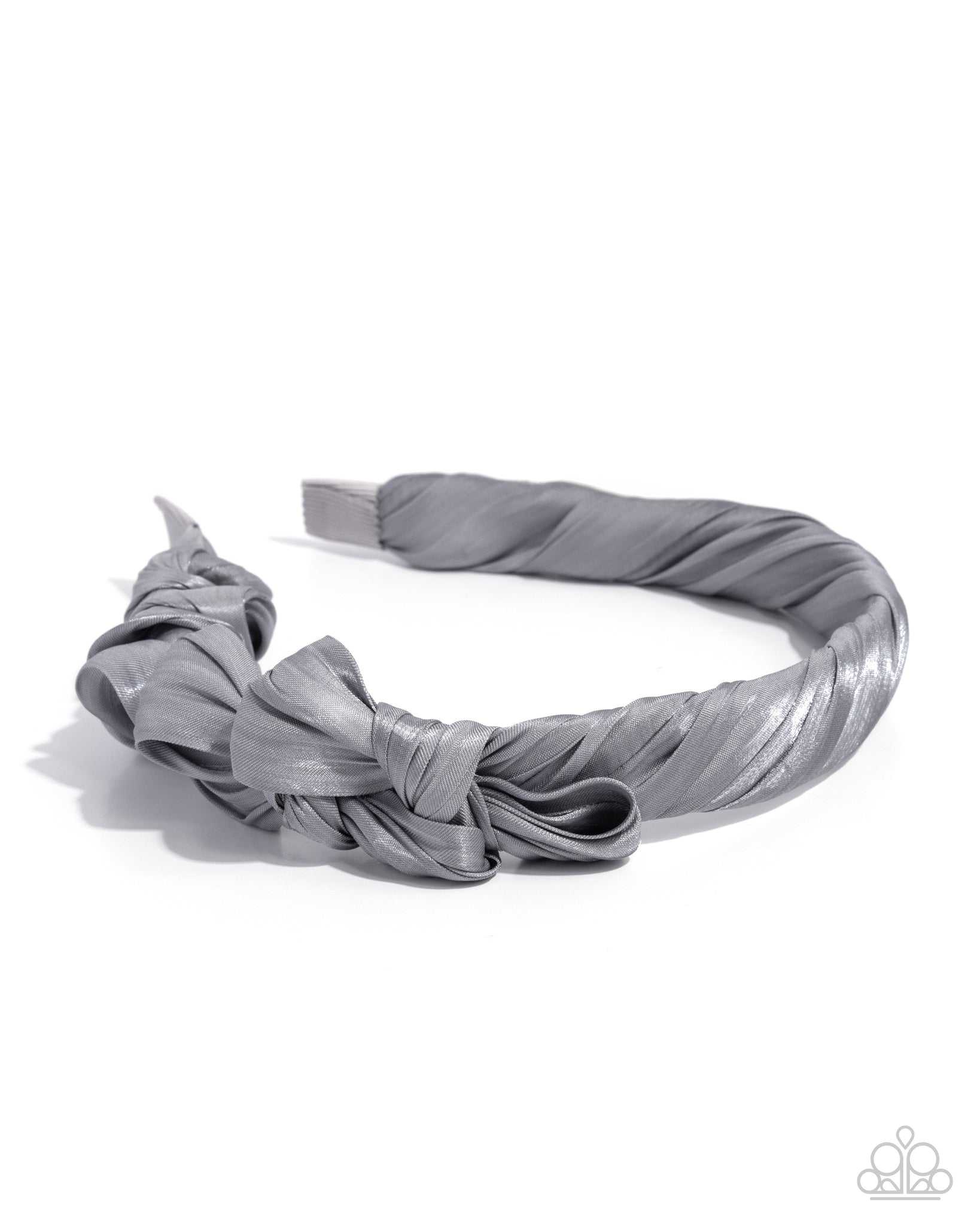 Featuring a subtle shimmer, a silver ribbon twists and ties atop the head into preppy bows, evoking an eye-catching, haute look.