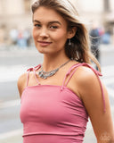 An array of intricately detailed flower charms, are strung along a bold silver curb chain. Several of the flowers are accented with sparkling white rhinestones, adding a touch of elegance and shimmer to the whimsical design. The lifelike details of the textured petals bring a nature-inspired flair to the necklace. Features an adjustable clasp closure.
