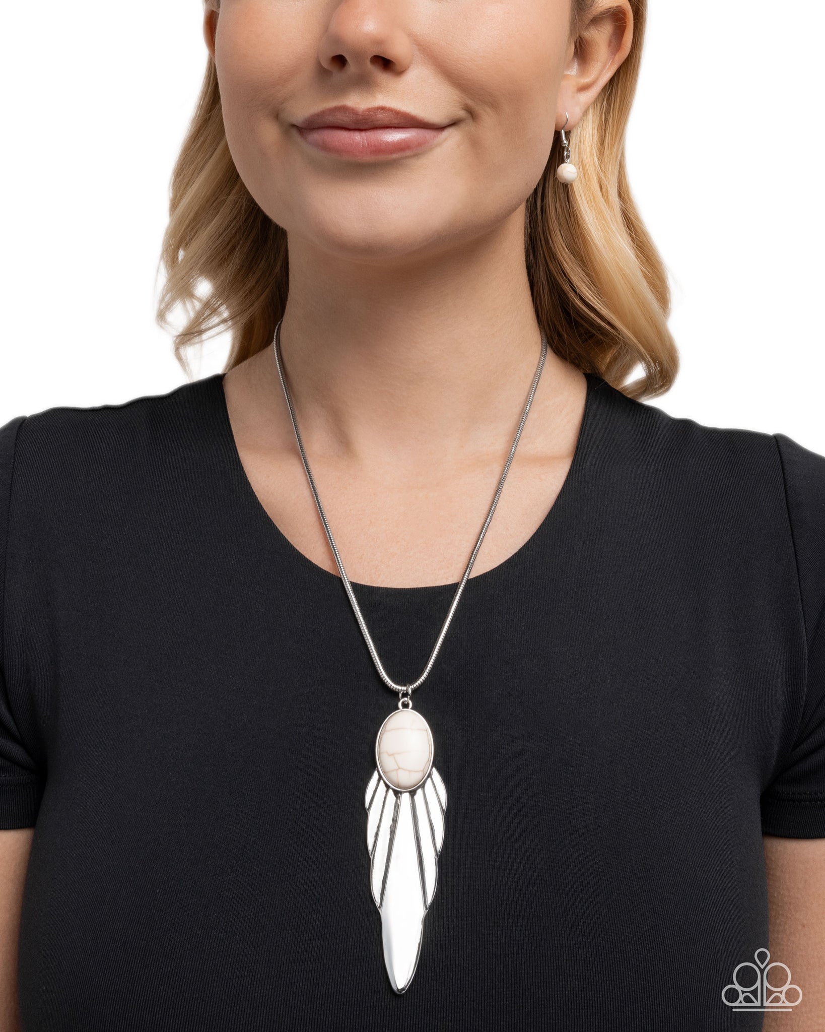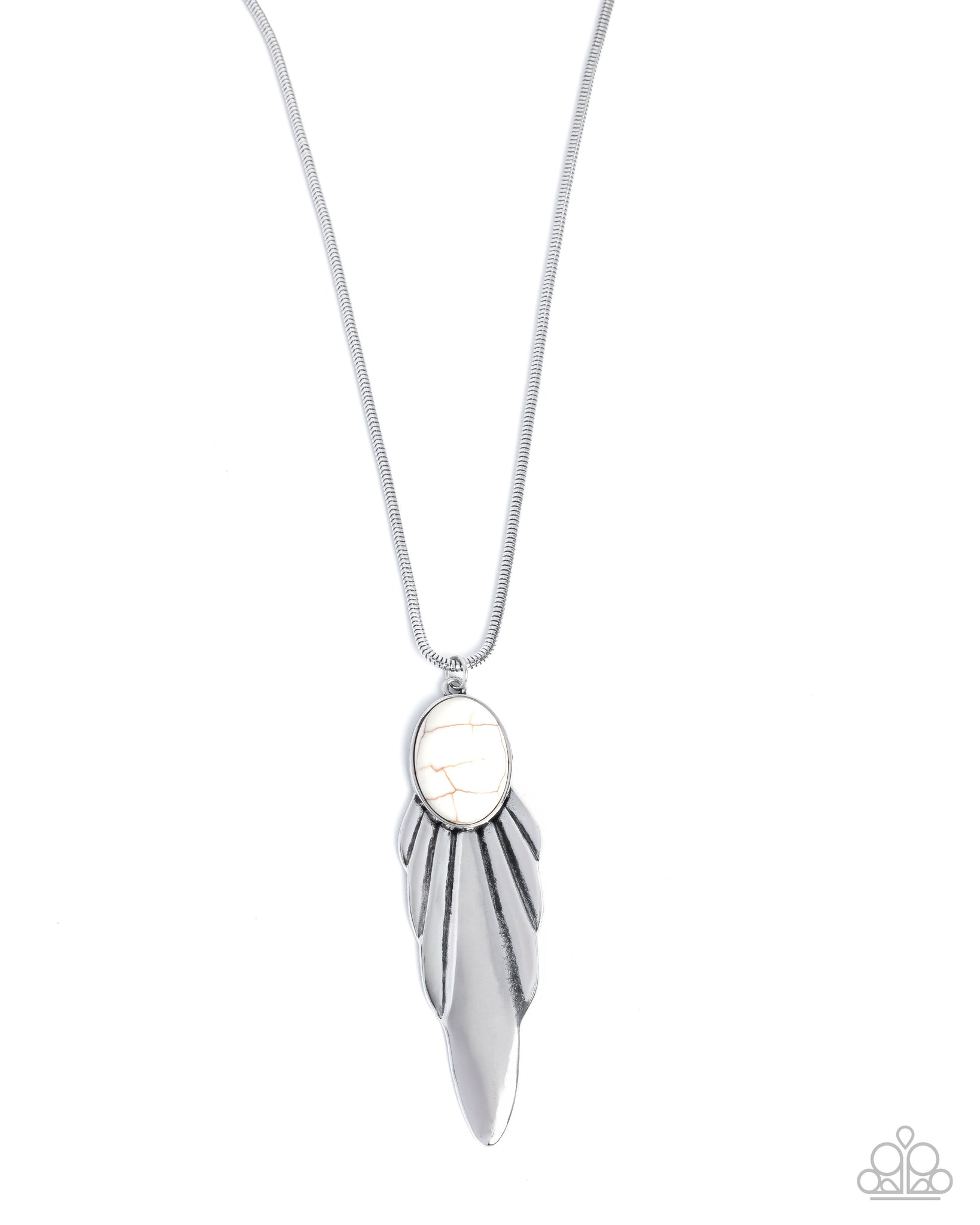 Featuring marbled detail, an oversized oval white stone dots the top of an elongated feather-like silver pendant, swinging from the bottom of a silver snake chain for a free-spirited whimsical finish. Features an adjustable clasp closure. As the stone elements in this piece are natural, some color variation is normal.