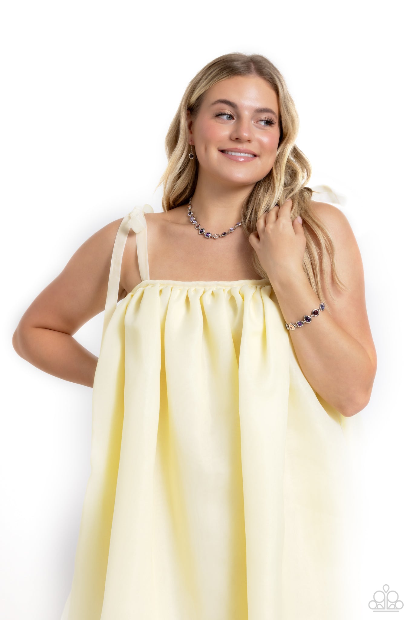Featuring various shapes and shades of purple, a collection of teardrop, round, heart, and square-cut gems in matching silver frames coalesce around the wrist for an abstract display of color and charm. Features an adjustable clasp closure.