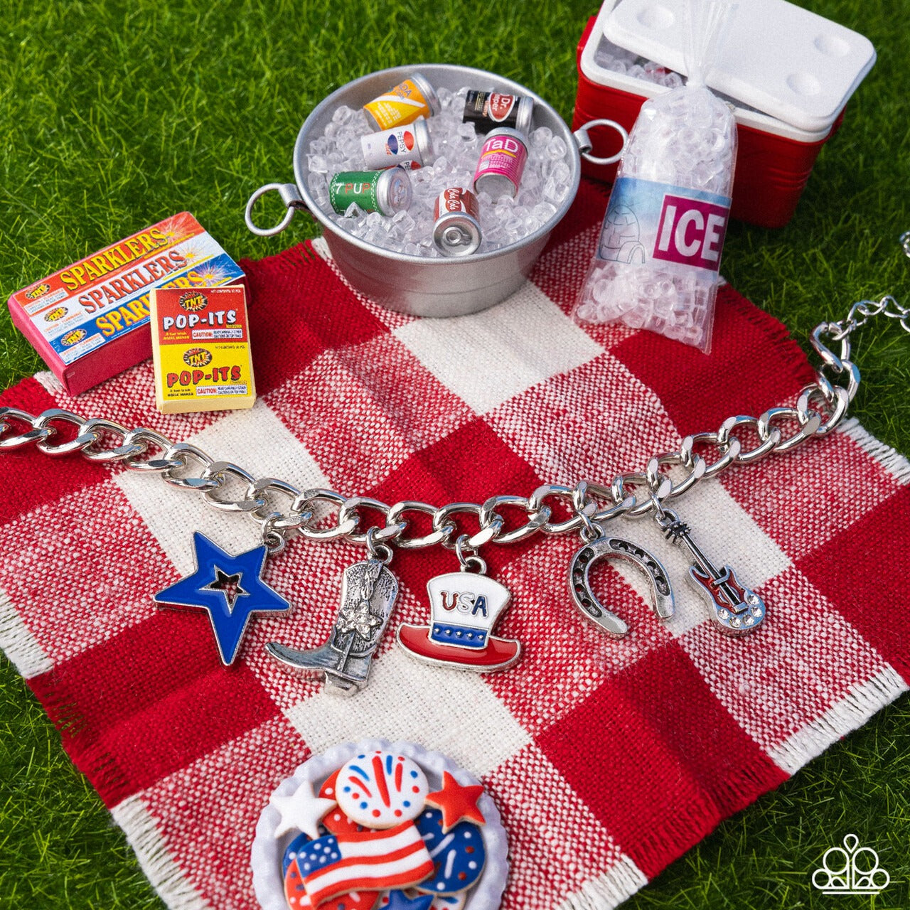 A bold silver curb chain is adorned with patriotic charms, including a blue-painted star, a rhinestone-accented cowboy boot, a red, white, and blue USA hat, a silver horseshoe, and a sparkling red guitar. Each charm adds a playful, Americana-inspired touch to the design. Features an adjustable clasp closure.
