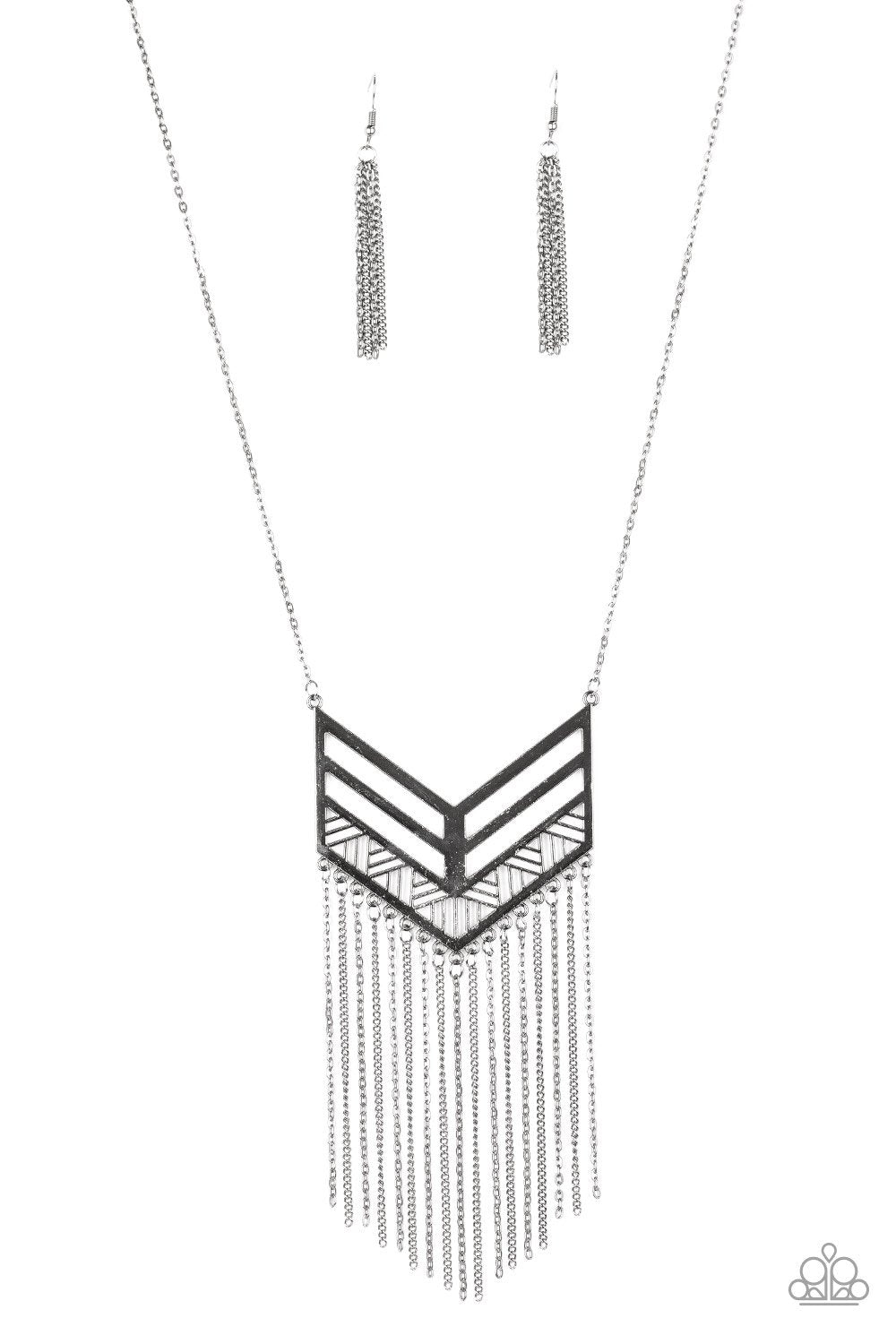 Featuring airy geometric accents, a fierce gunmetal pendant swings from the bottom of a lengthened gunmetal chain. Tapered gunmetal chains swing from the bottom of the bold pendant, adding a wanderlust edge to the tribal inspired palette. Features an adjustable clasp closure.