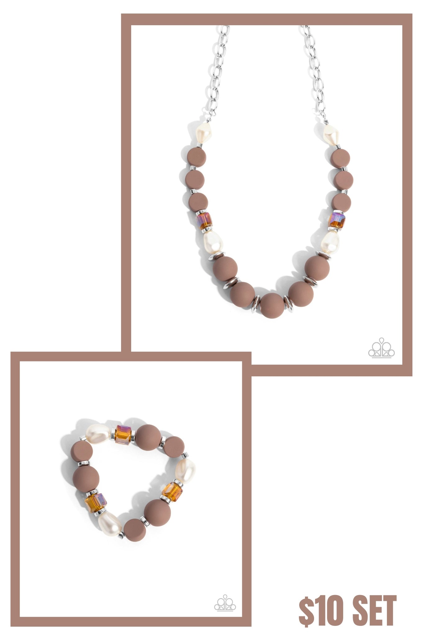 NECKLACE: Infused along a silver paperclip chain, a collection of baroque white pearls, silver cubed beads, flat brown acrylic beads, silver discs, topaz cubes, and rounded brown acrylics cascade below the neckline in a refined pattern for a pop of corporate color. Features an adjustable clasp closure.