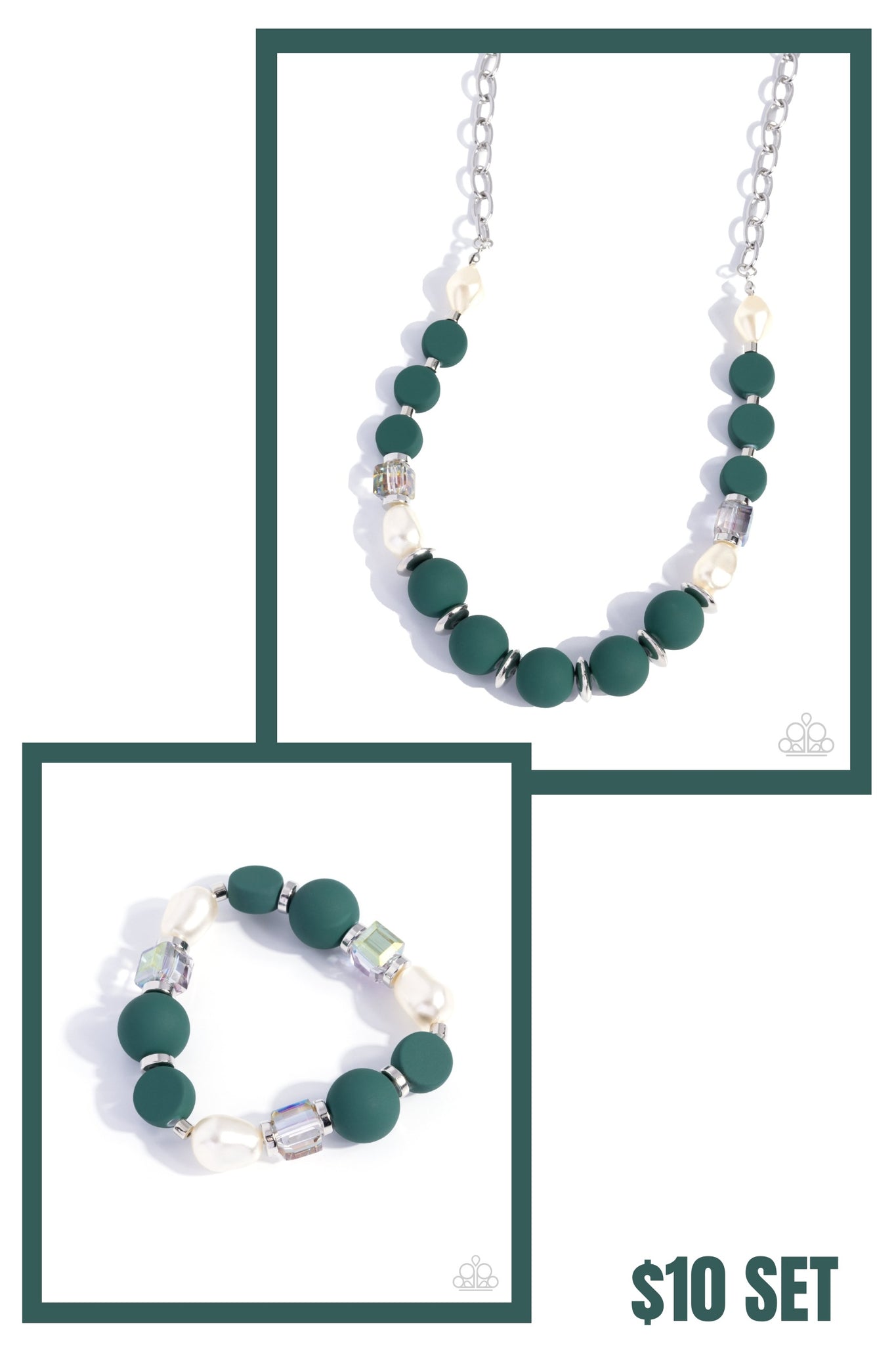 BRACELET: Like-Minded • Green P9RE-GRXX-171GQ: Infused along an elastic stretchy band, a collection of baroque white pearls, silver cubed beads, flat Aventurine acrylic beads, silver discs, smoky cubes, and rounded Aventurine acrylics cascade around the wrist in a refined pattern for a pop of corporate color.