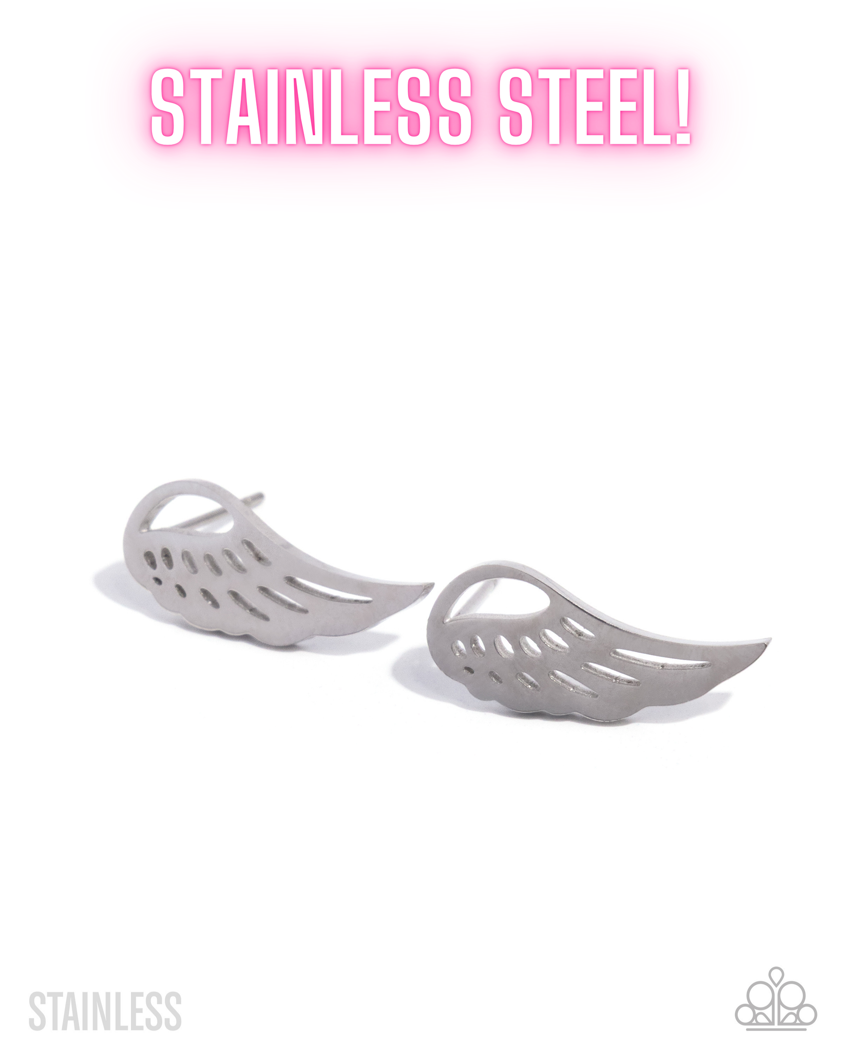 Featuring stainless steel, a textured silver angel wing sits atop the ear for a sensational display. Earring attaches to a standard post fitting.