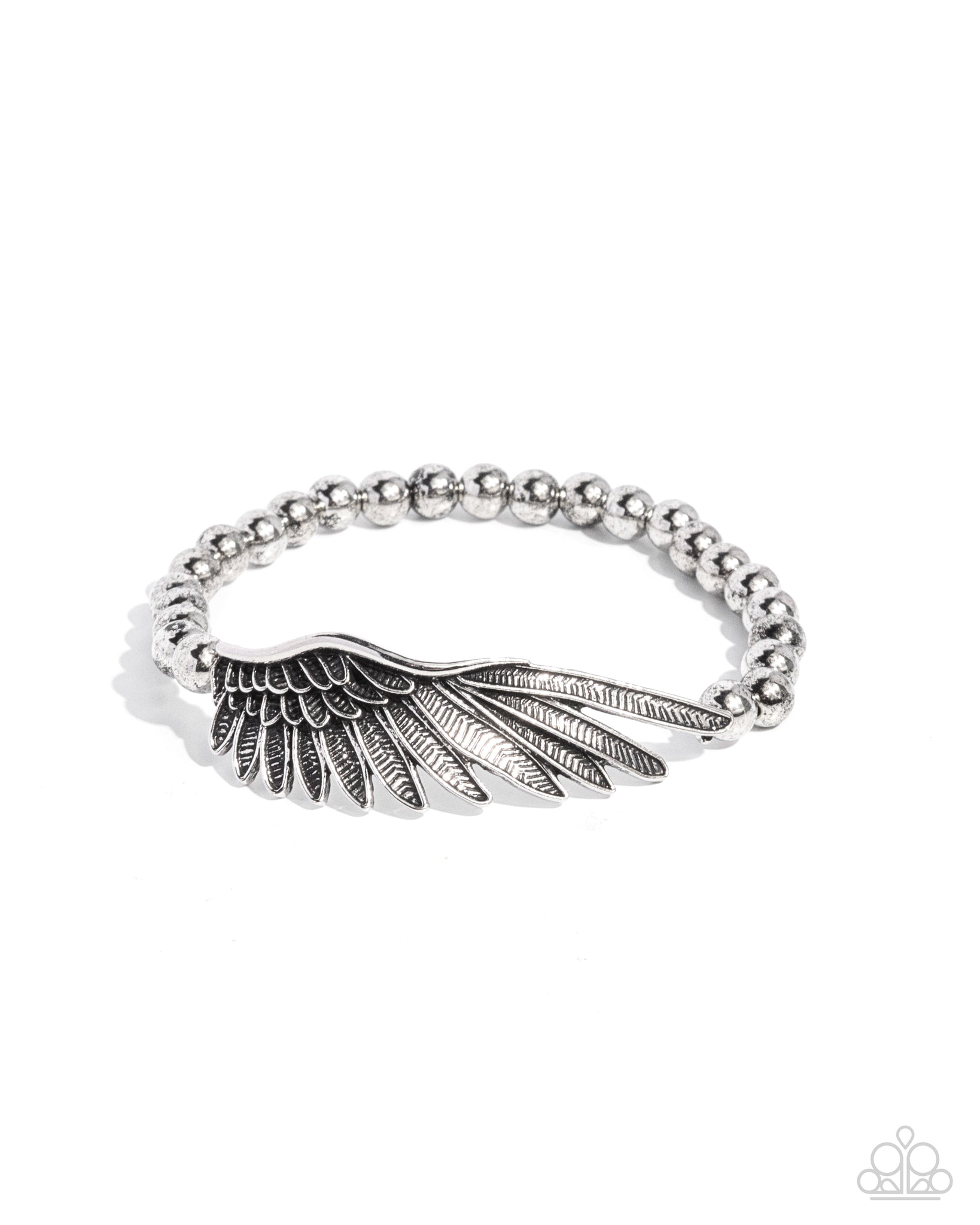 Etched in tactile texture, a three-dimensional silver half-angel wing is featured at the center of the wrist beside subtly hammered silver beads that are infused along an elastic stretchy band for a celestially chic display.
