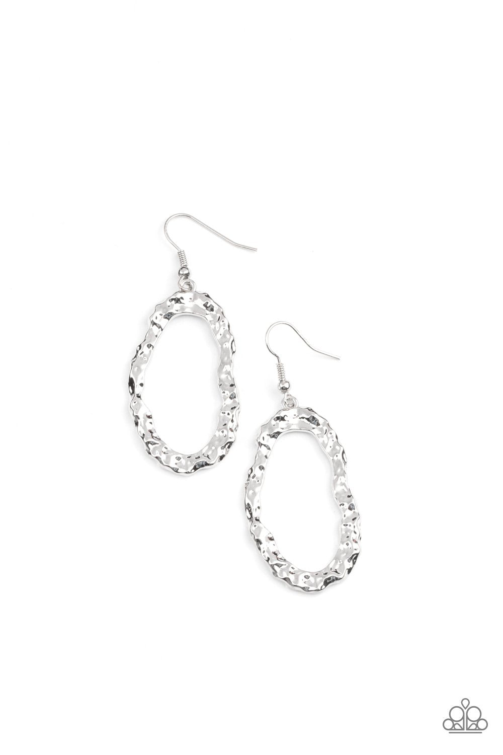 A high sheen silver oval frame is hammered into an asymmetrical frame, creating an edgy display. Earring attaches to a standard fishhook fitting.