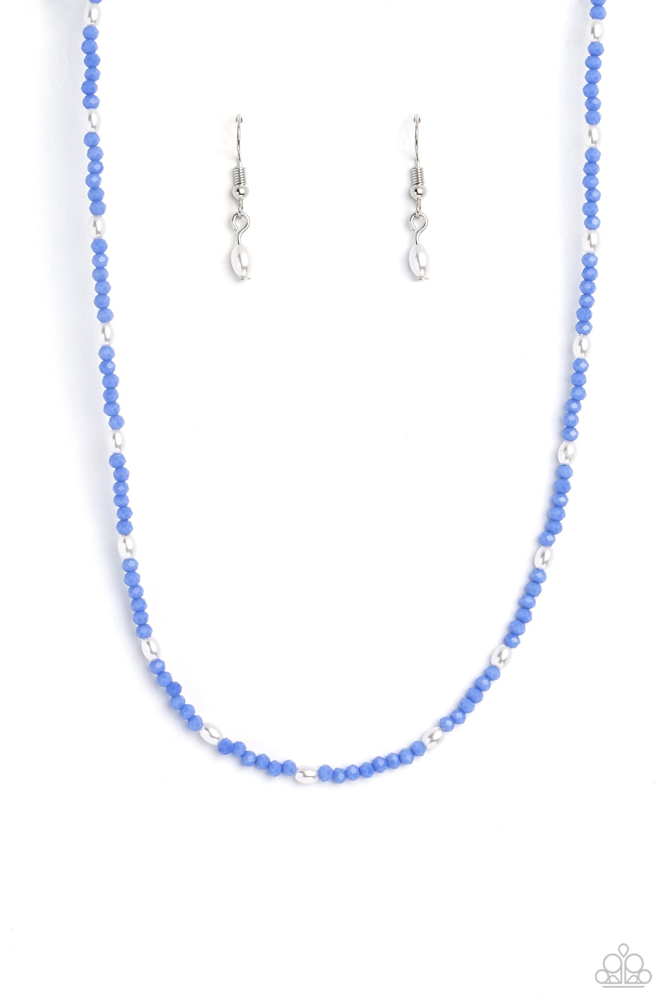 A dainty row of faceted blue crystal-like seed beads delicately links around the neck, resulting in a radiant glimmer. Dainty white, oval pearls infused along the neckline create additional refinement and charm to the design. Features an adjustable clasp closure.