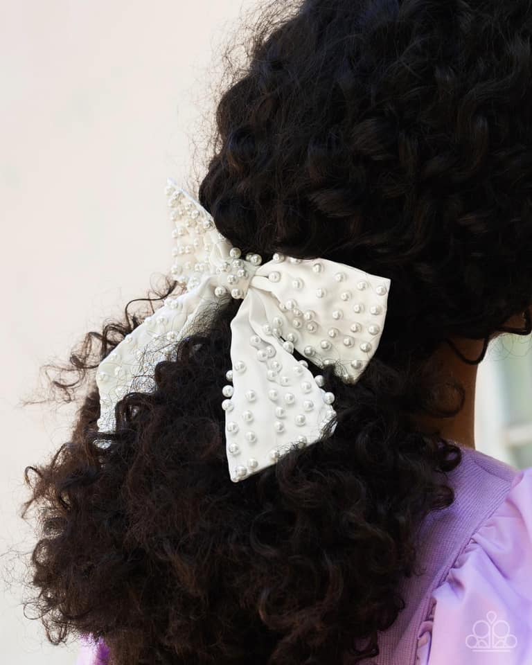 Embellished with countless high-sheen white pearls a satin white ribbon is tied into a refined bow centerpiece. Features a standard hair clip on the back.