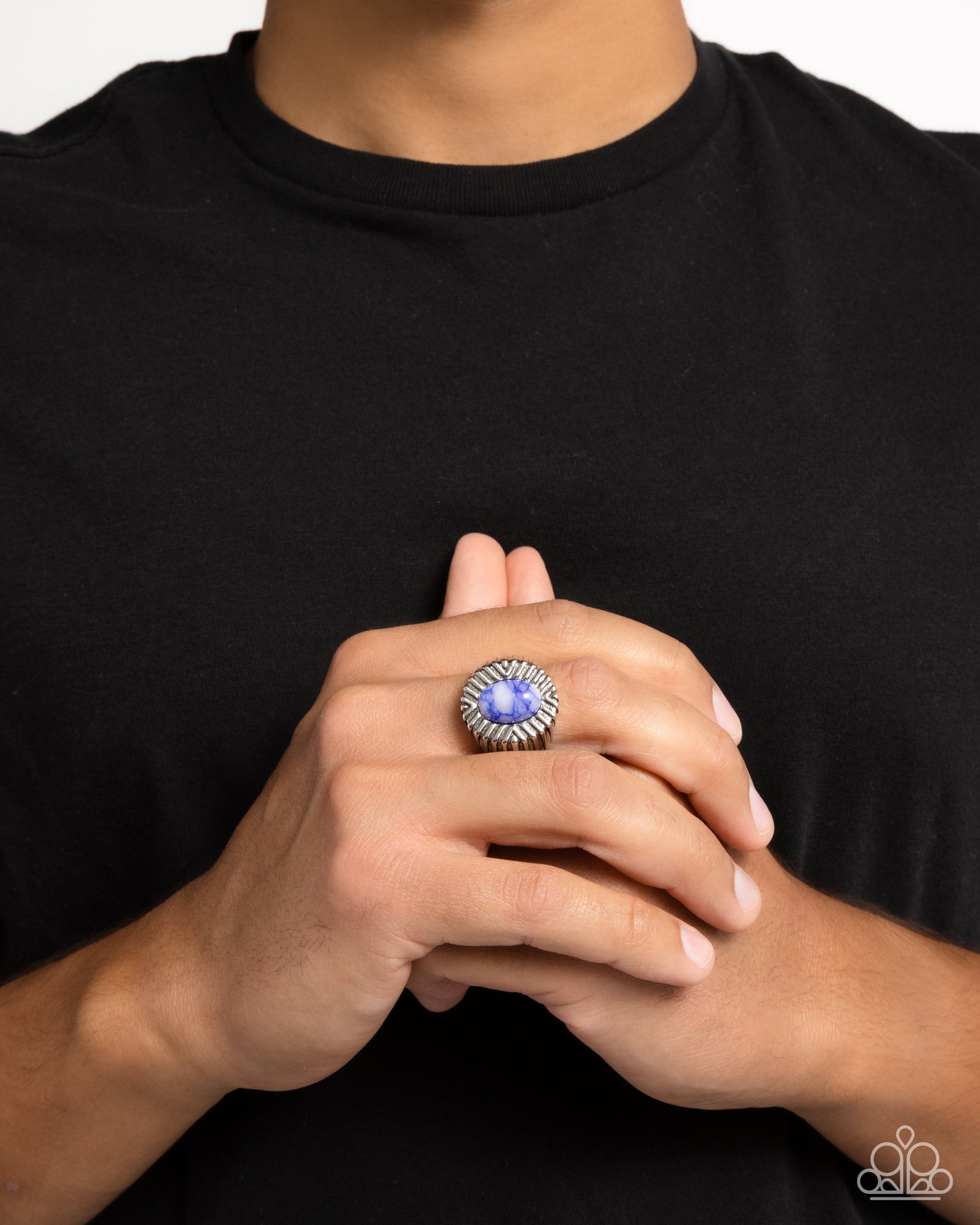 Brushed in a high-sheen finish, edgy geometric bars of silver pattern and frame around a blue-marbled oval stone for an unforgettably urban centerpiece atop a geometric-textured thick silver band. Features a stretchy band for a flexible fit. As the stone elements in this piece are natural, some color variation is normal.