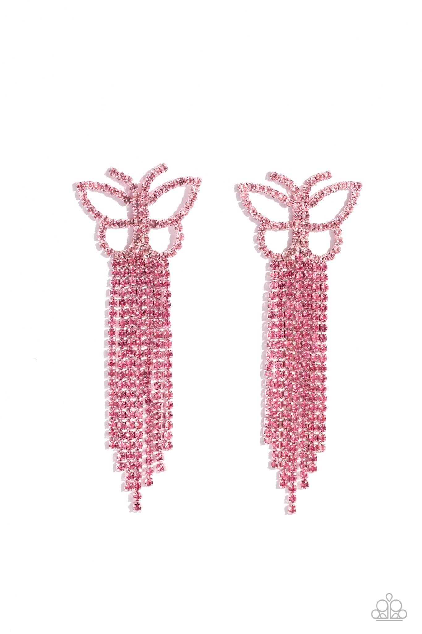 Glassy pink rhinestones, encrusted along the front of a pink butterfly frame, create a whimsical centerpiece. Staggered rows of different pink rhinestones pressed in delicate silver square fittings cascade from the sparkly centerpiece, seemingly lifting the butterfly off to its glitzy flight. Earring attaches to a standard post fitting.