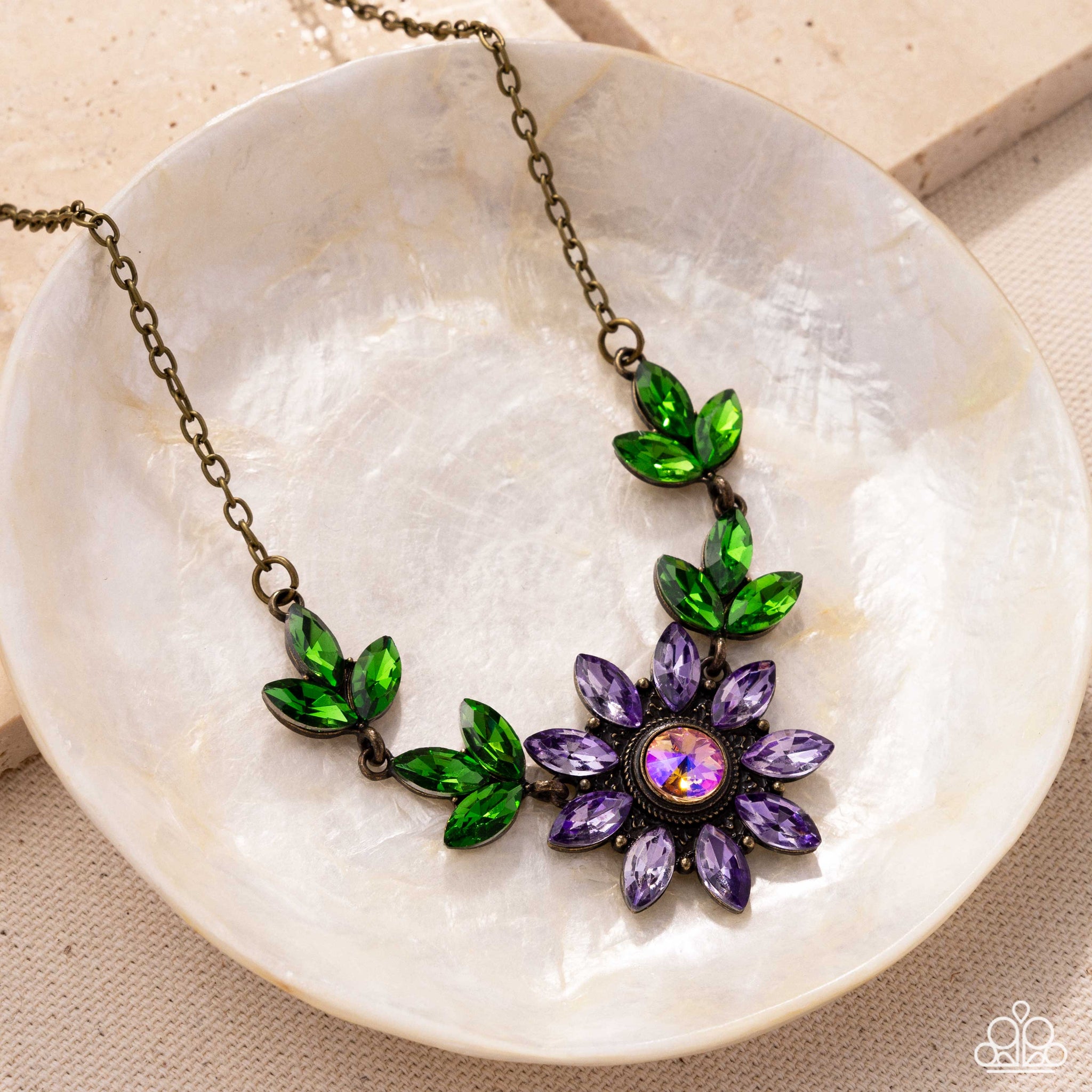 A brass chain showcases a floral-inspired centerpiece featuring marquise-cut green rhinestone leaves and purple rhinestones forming a radiant flower. A sparkling orange UV-shimmery gem accents the center of the design, adding a touch of brilliance. Features an adjustable clasp closure.