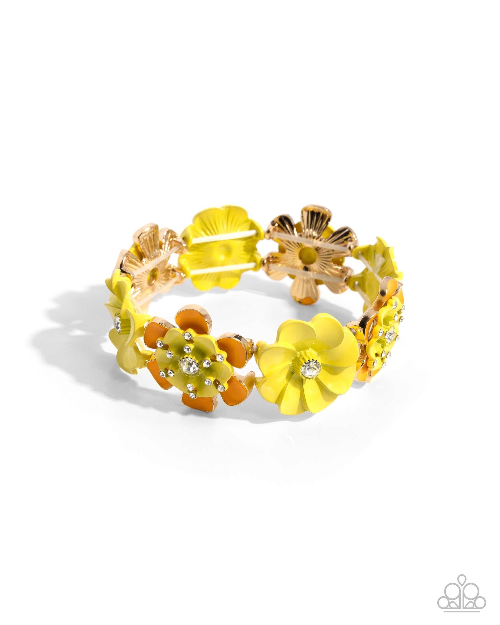 BRACELET: Exhilarating Elegance • Yellow P9ST-YWXX-013EK: Infused along elastic stretchy bands, a collection of Saffron-painted gold flowers with a three-dimensional layered Lemon Drop flower atop alternates with solitaire textured Lemon Drop flowers along the wrist for a whimsical look. White rhinestones stack and stream out from a white gem center atop the layered flowers while the Lemon Drop flowers feature white gem centers for a shimmery finish.