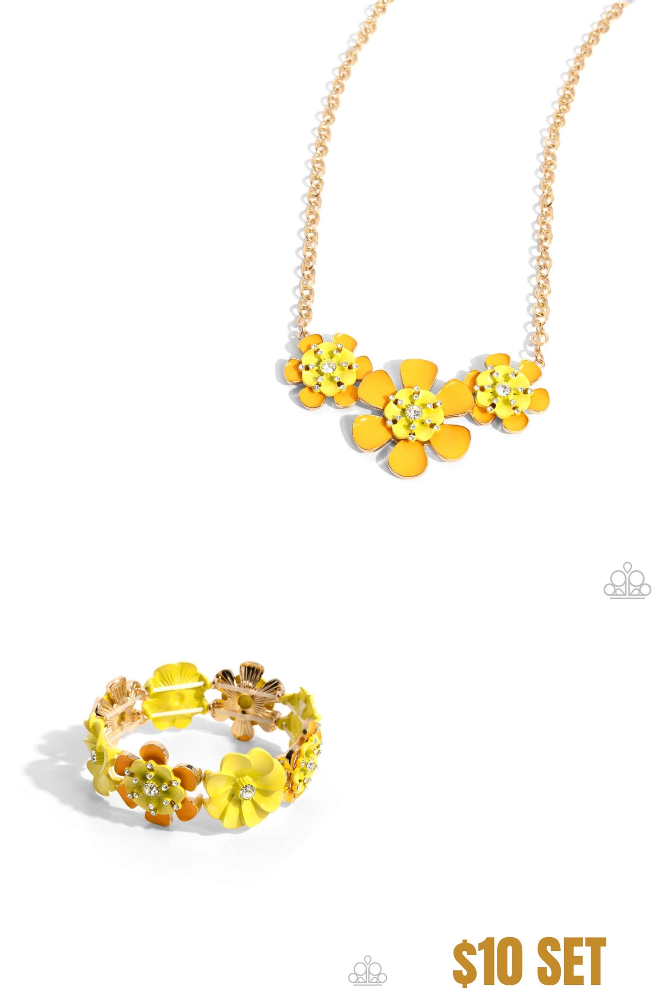 NECKLACE: Connecting along a gold-linked chain, a trio of Saffron-painted gold flowers with a three-dimensional layered Lemon Drop flower atop it blooms below the neckline in varying sizes for a whimsical look. White rhinestones stack and stream out from a white gem center atop the Lemon Drop flowers for a shimmery finish. Features an adjustable clasp closure.