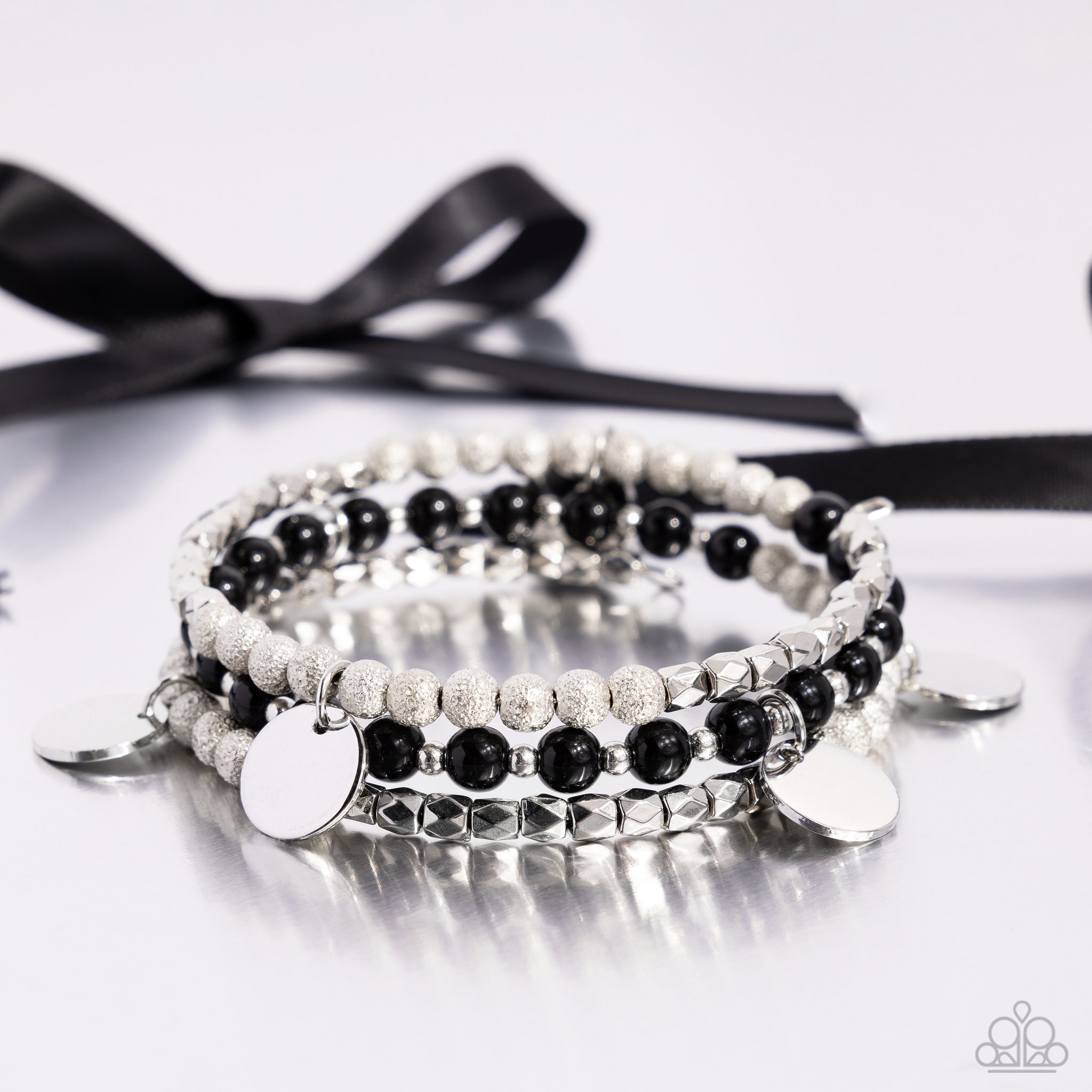 Threaded along a wire that coils around the wrist, a collection of silver beads, silver shatter beads, black beads, sleek silver discs, and textured faceted silver beads create a colorful, beachy infinity wrap style bracelet.
