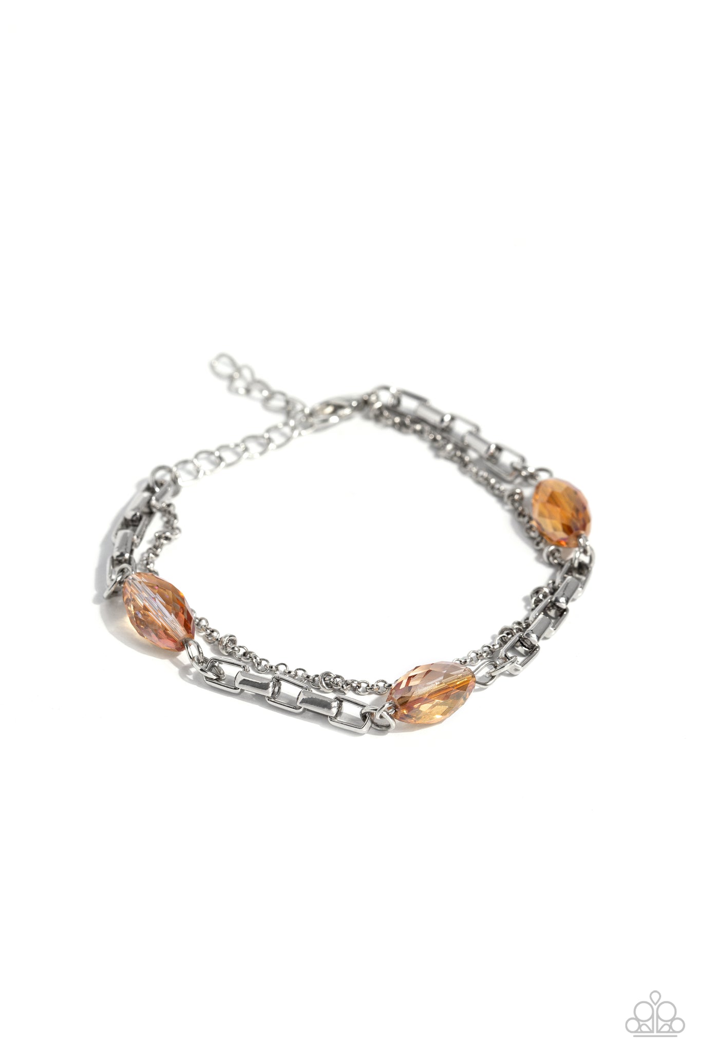 Silver rectangular links and a dainty silver chain combine to create a high-sheen statement around the wrist. Infused along the rectangular links, three reflective orange rhombus beads create a subtle pop of color along the monochromatic design. Features an adjustable clasp closure.