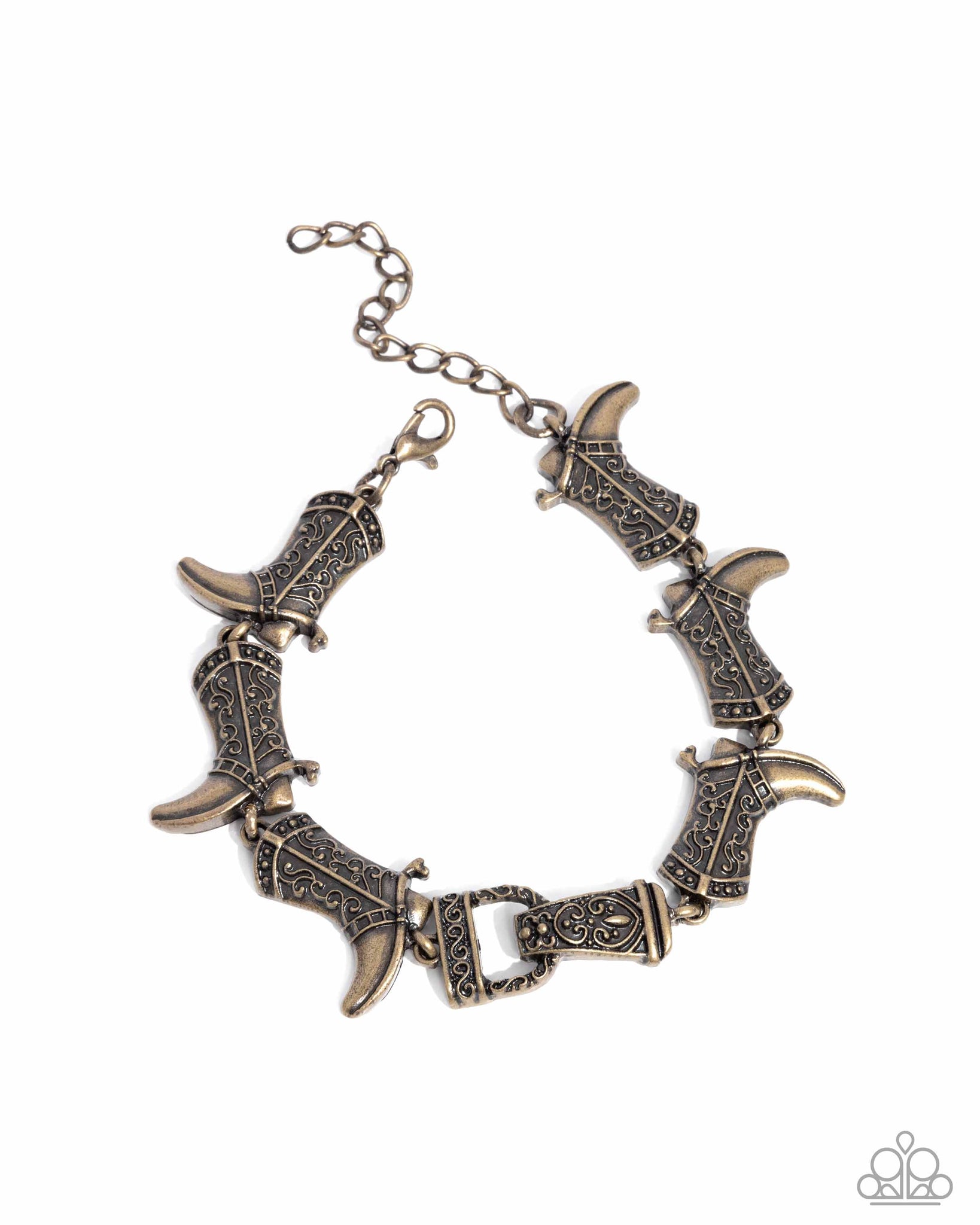 Seemingly cascading from a textured filigree-embellished brass stirrup, a collection of similarly textured brass cowboy boots loop along the wrist for a whimsically Western look. Features an adjustable clasp closure.