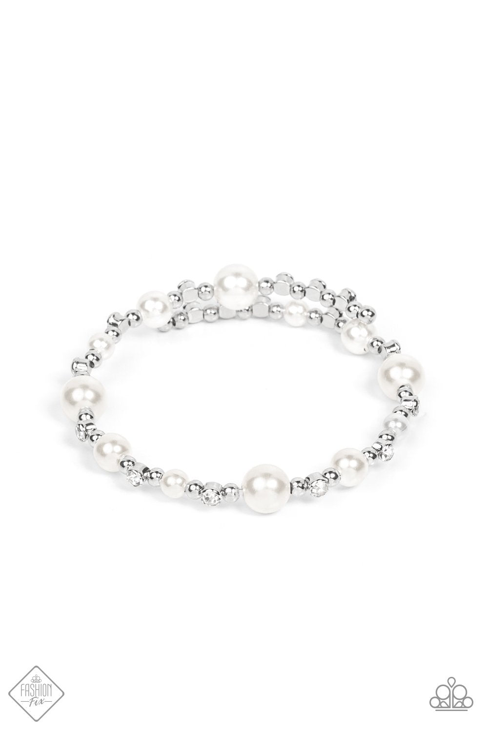 Luscious bubbly pearls and brilliant white rhinestones are accented with shiny silver beads threaded along a single wire to create a chicly glamorous infinity wrap bracelet.