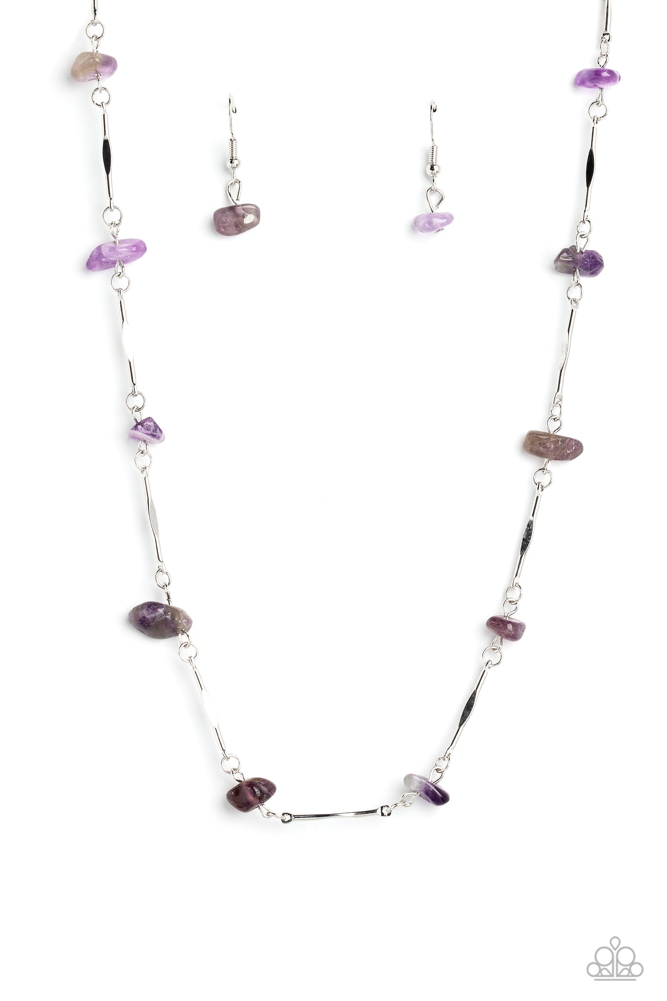 Chiseled pieces of amethyst stones alternate with skinny silver bars featuring flattened centers that delicately link around the neckline for a free-spirited finish. Features an adjustable clasp closure. As the stone elements in this piece are natural, some color variation is normal.