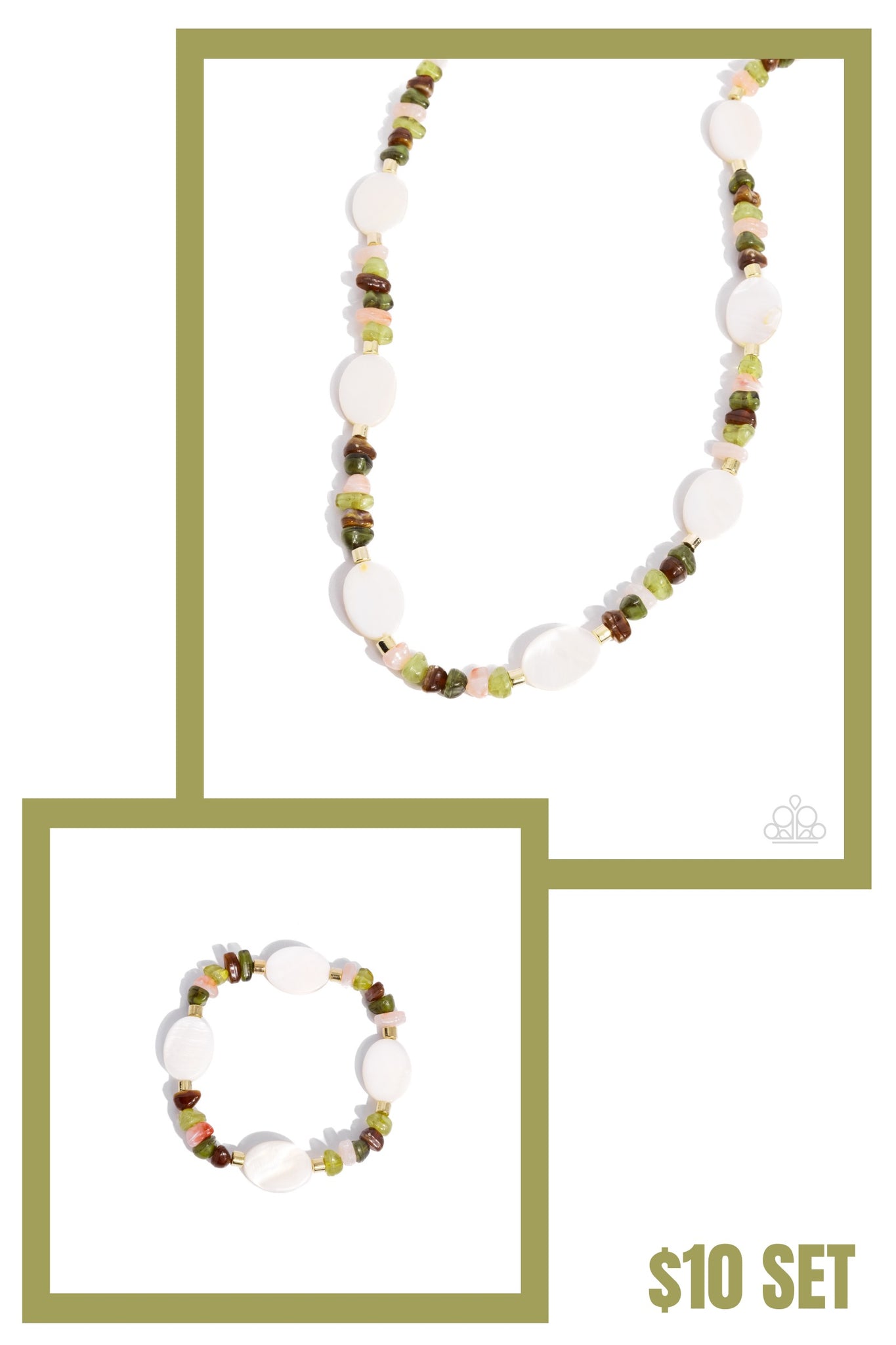 BRACELET: Cheerleading Cay • Green P9SE-GRXX-186FH: Infused along an elastic stretchy band, a collection of gold beads, white oval shells, and chiseled topaz, light pink, olive, and Fern beads pattern around the wrist for a pop of coastal color.