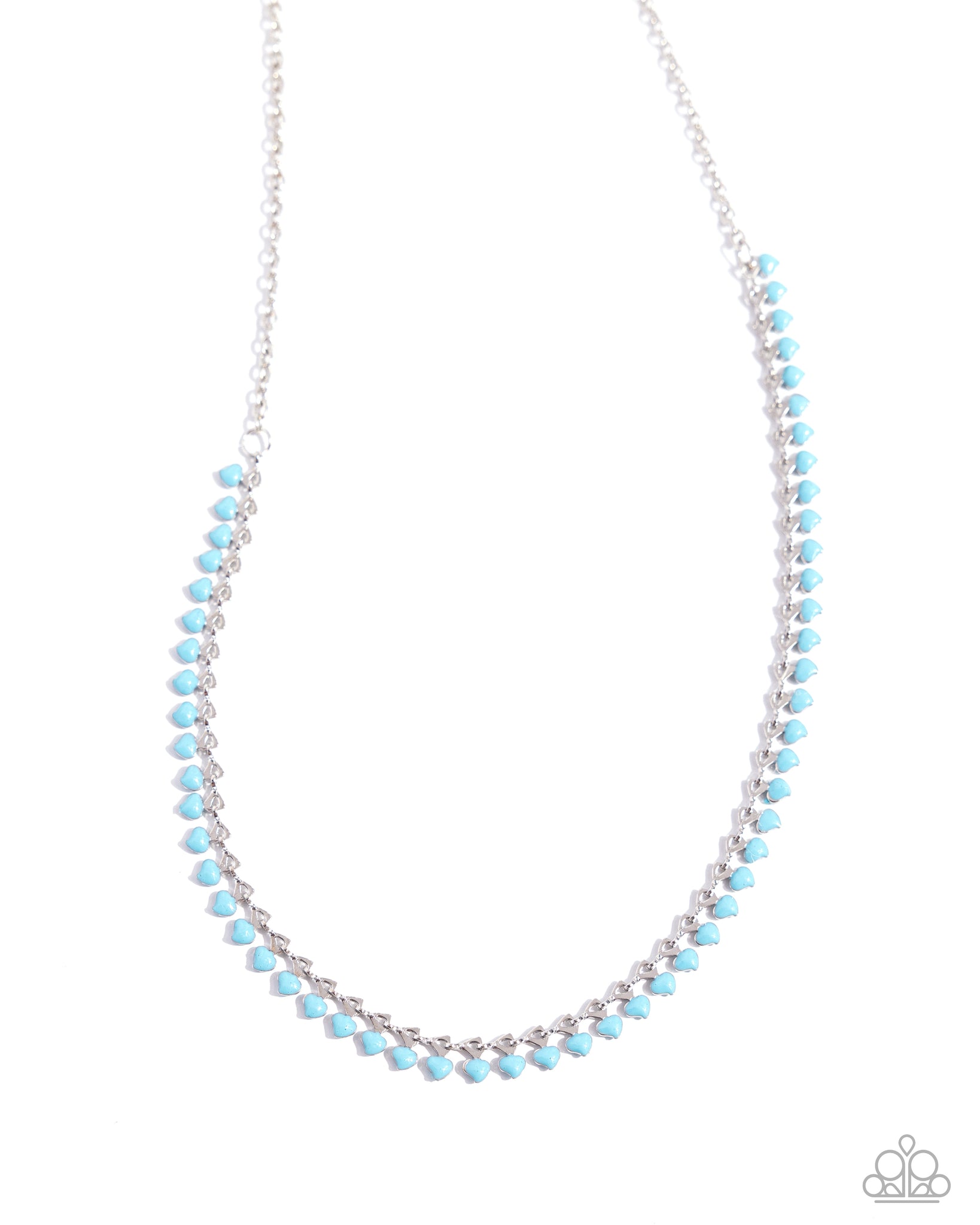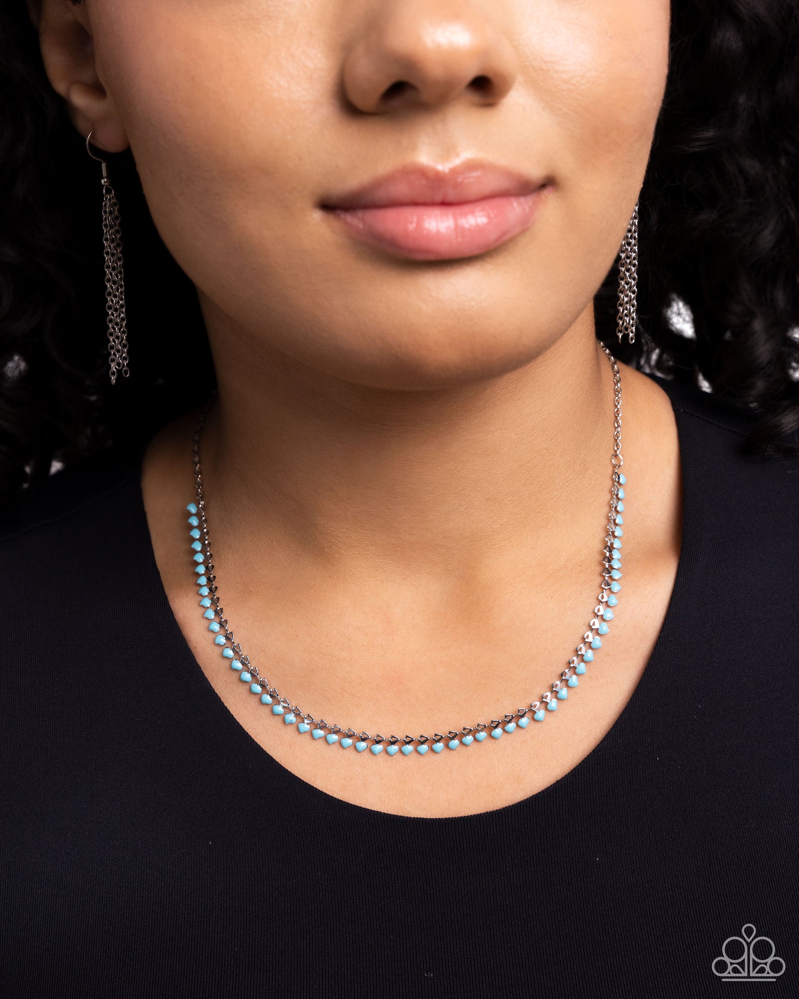 Connecting to a dainty silver chain, a collection of dainty silver jump rings coalesces around the neckline. Dripping below the jump rings, a collection of Capri beads adds a pop of vibrant color to the design. Features an adjustable clasp closure.