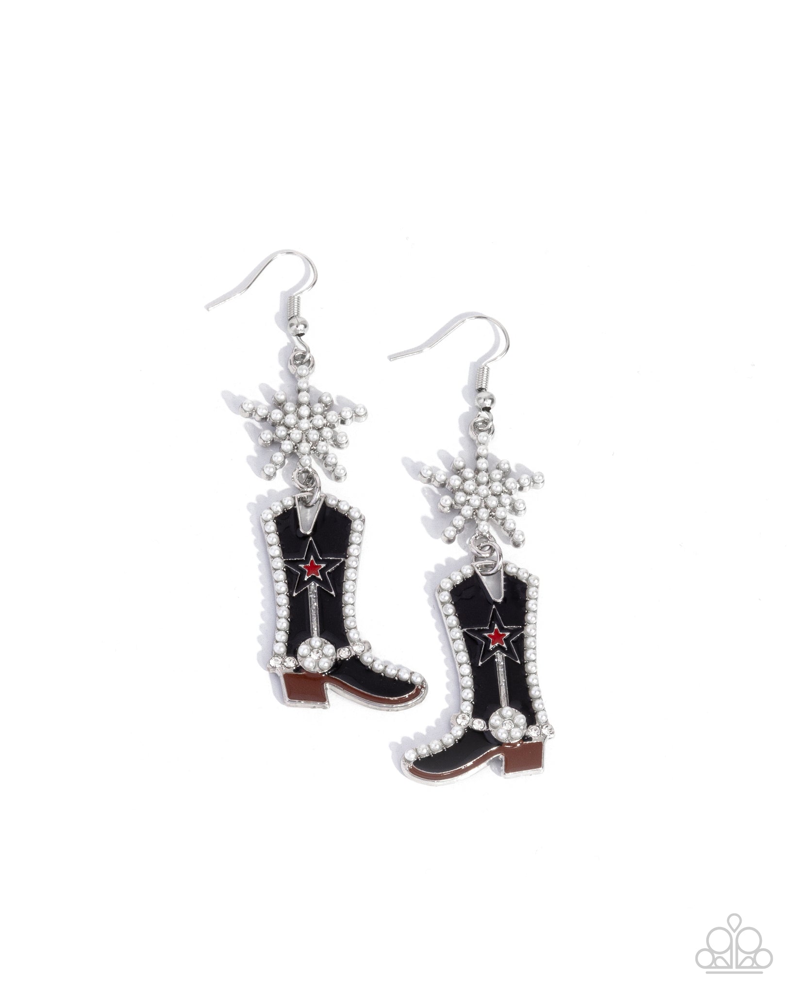 Embellished in dainty white pearls an explosive silver star gives way to a black-painted cowboy boot. Lined with brown and red-painted details, white rhinestones, and similar dainty white pearls, the cowboy boot kicks below the ear for a Western whimsical look. Earring attaches to a standard fishhook fitting.