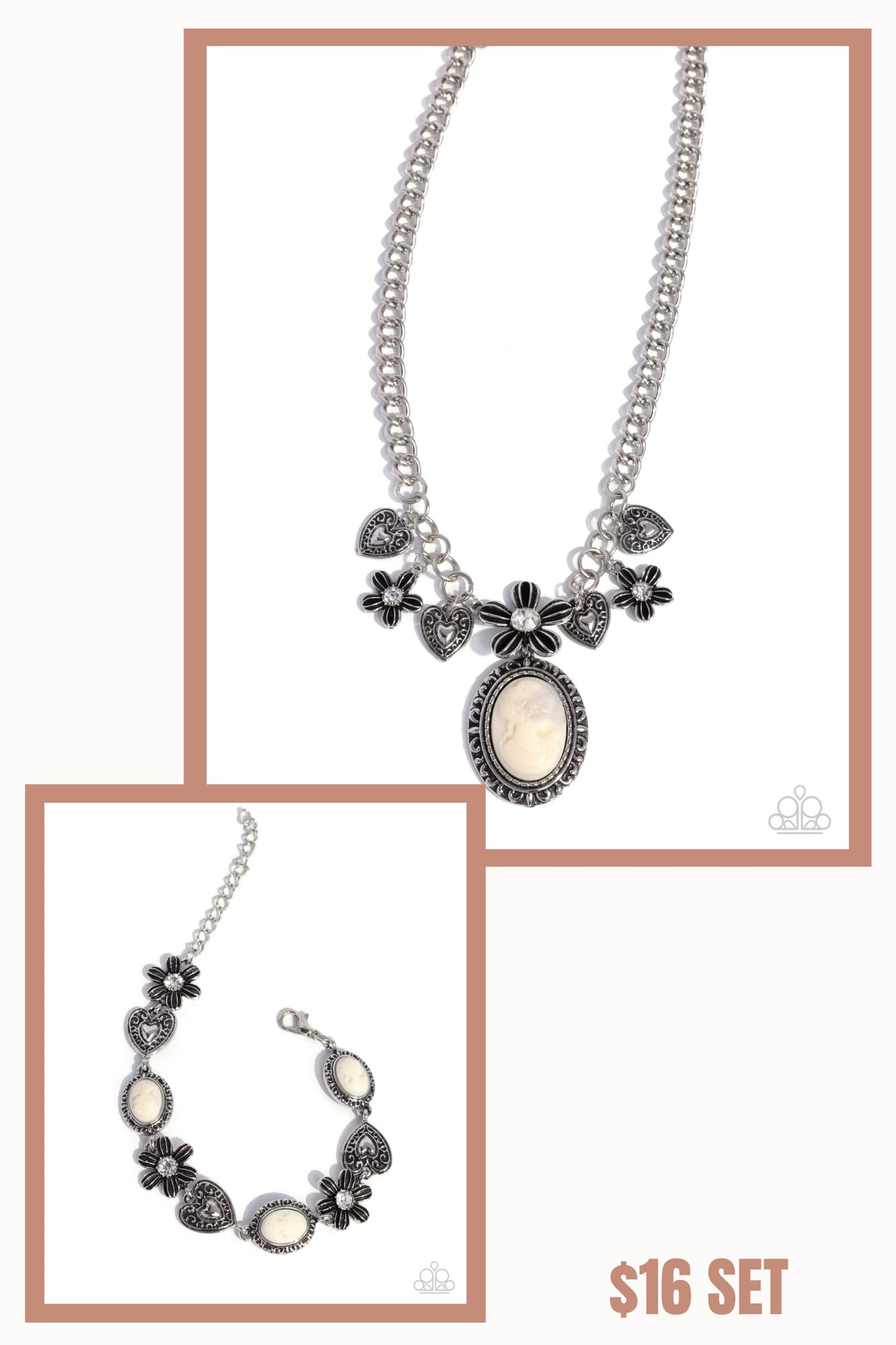 NECKLACE: Vintage Story • White P2ST-WTXX-189IO: Featuring curly filigree, layered silver hearts sway and alternate beside textured silver flowers with white gem centerpieces along the neckline from an oversized silver cable chain. Pressed in a vintage silver frame, an ivory-tinted cameo pendant gives way from the centermost, larger textured silver flower for an heirloom haute-inspired finish. Features an adjustable clasp closure.