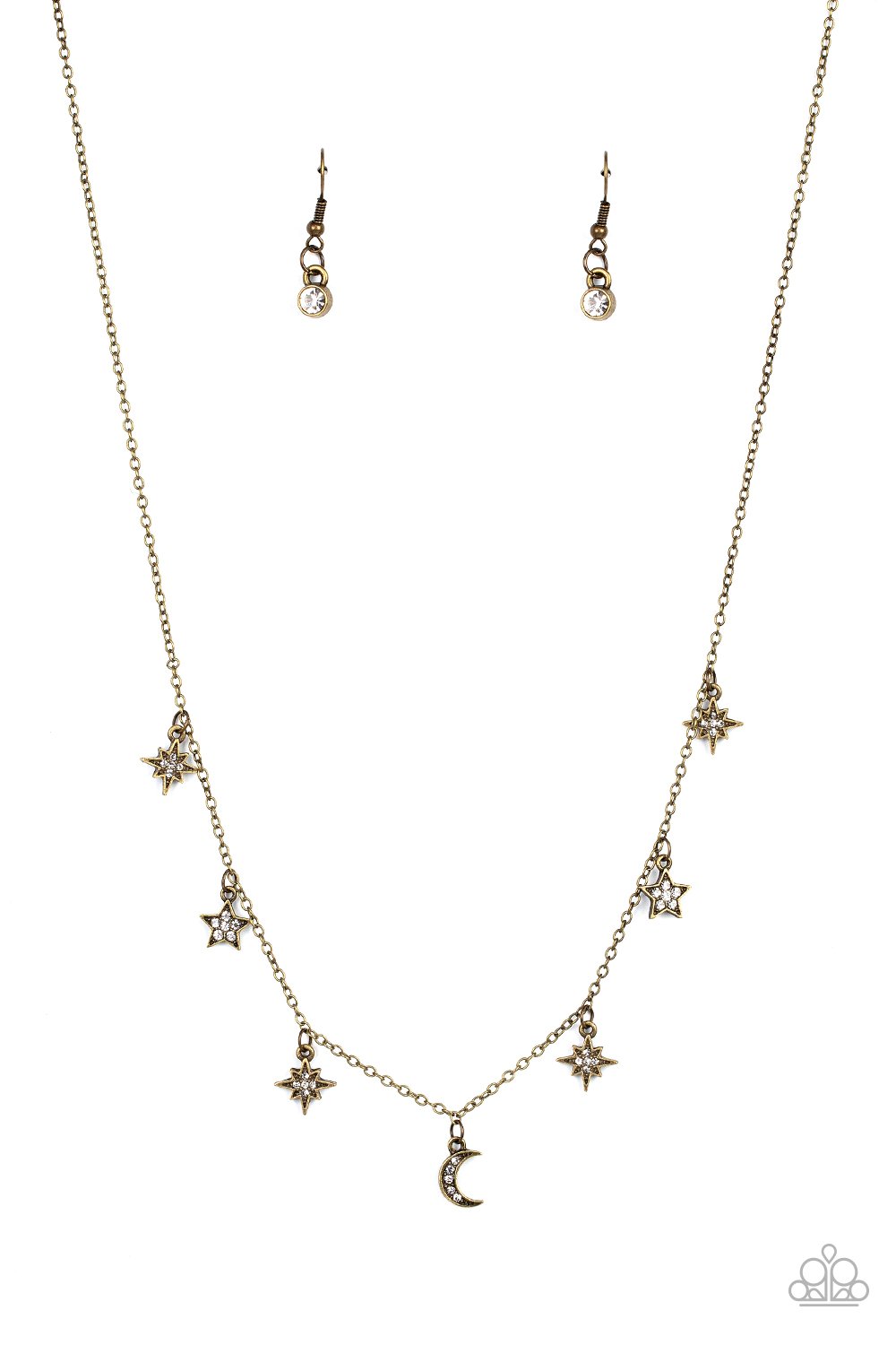 Dotted with dainty white rhinestones, a stellar collection of brass moon and star charms swing from a dainty brass chain below the collar, creating a cosmic fringe. Features an adjustable clasp closure.