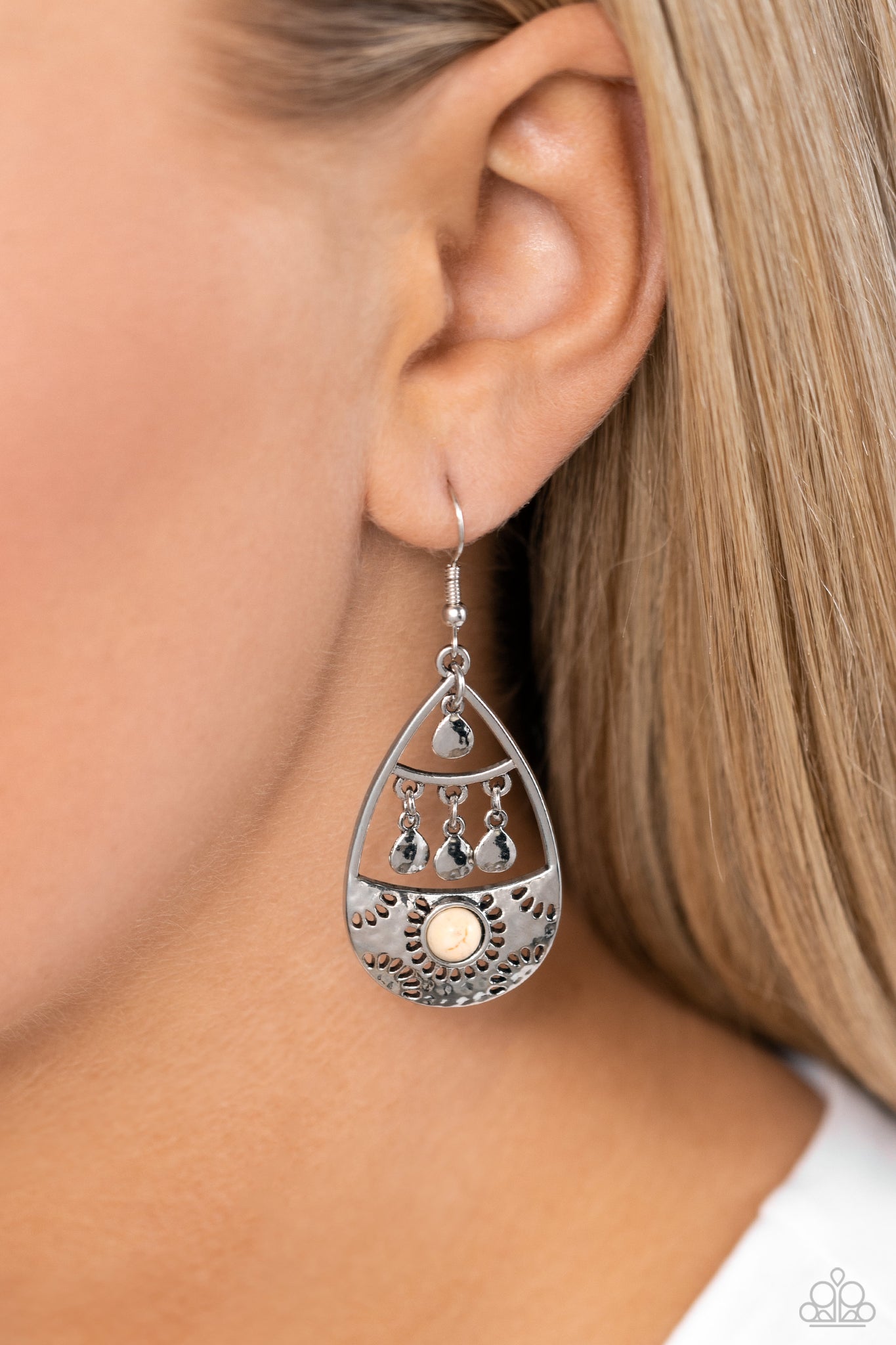 Tiers of hammered silver teardrops swing from the top of an airy silver teardrop frame. Featuring a stenciled floral motif and single white stone, a hammered half moon plate is pressed into the bottom of the frame for a rustic flair. Earring attaches to a standard fishhook fitting.