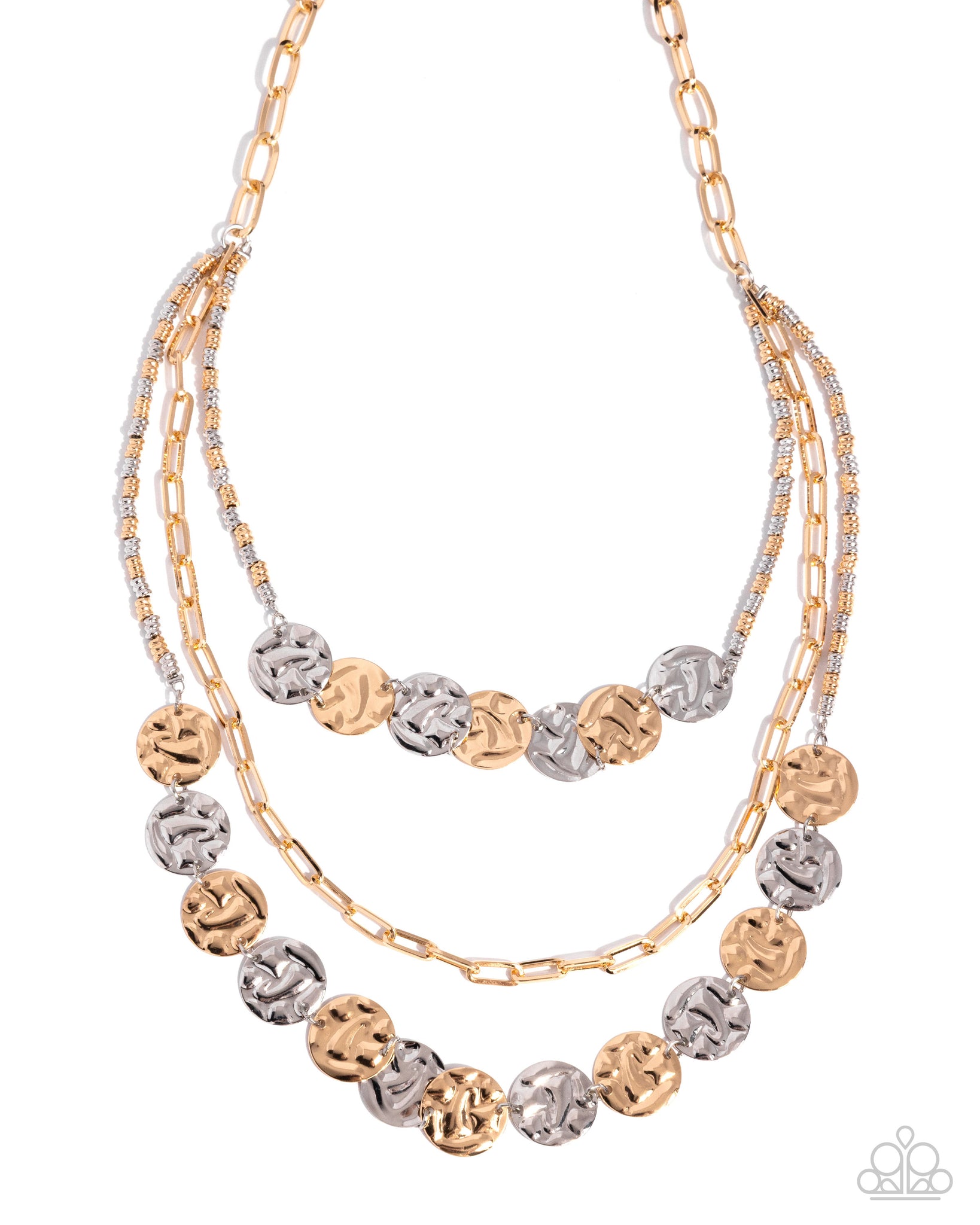 Connecting to a glistening gold paperclip chain, a trio of mismatched strands layer and coalesce below the neckline. Textured gold and silver cylindrical beads alternate along the upper and lowermost strands, leading the eye to an alternating collection of gold and silver hammered discs, while an additional paperclip chain creates the centermost chain for a dynamic, yet basic display. Features an adjustable clasp closure.