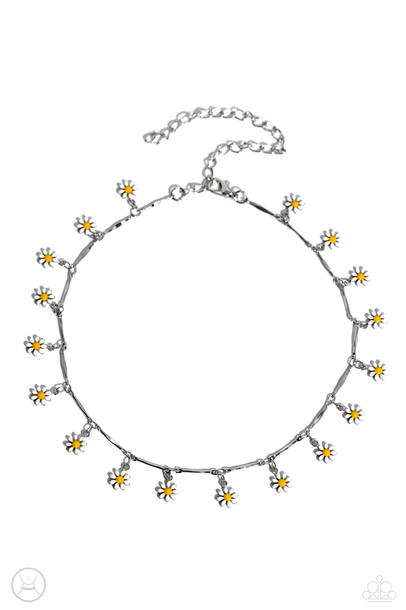 Featuring bright yellow centers, dainty white-petaled silver flowers drip between shiny silver bars along the collar, creating a dainty, floral fringe. Features an adjustable clasp closure.