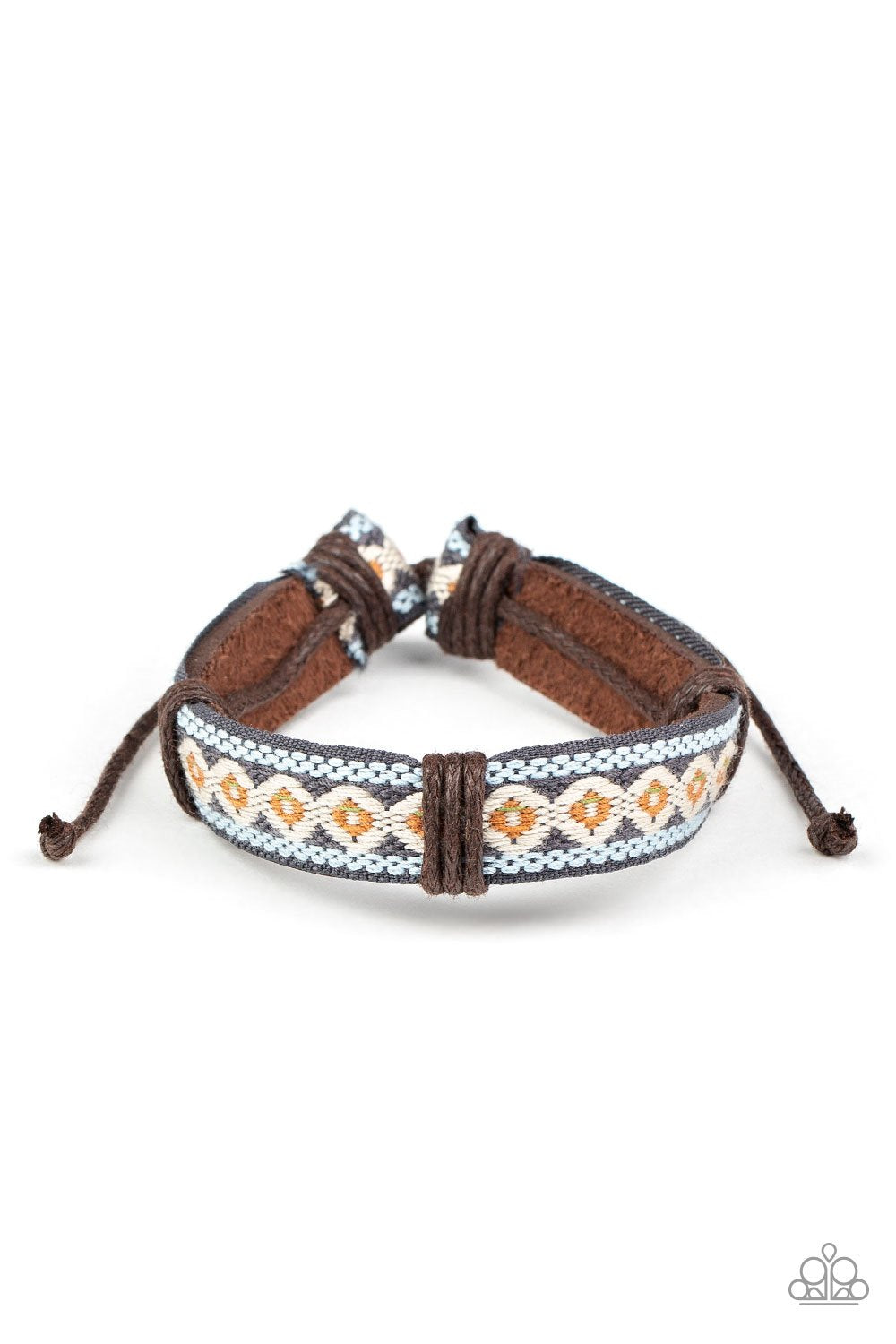 Featuring a threaded textile pattern, a colorful ribbon is knotted in place along a piece of brown leather, creating a whimsically rustic centerpiece around the wrist. Features an adjustable sliding knot closure.