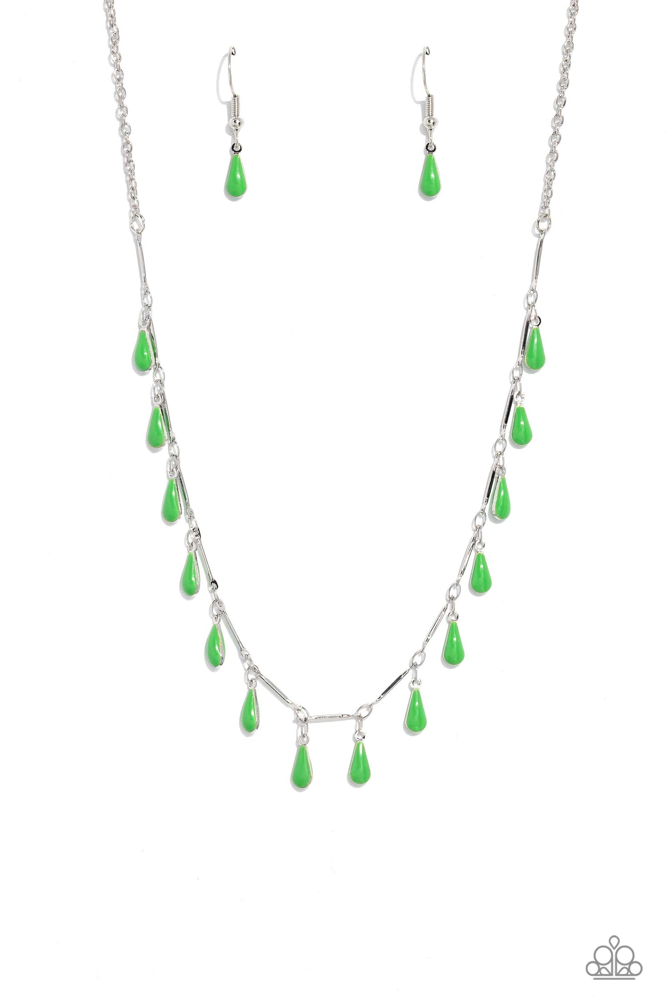 Infused along a dainty silver chain, thin silver bars and dainty, elongated green teardrops drip down the neckline for a fashionable, subtle pop of color. Features an adjustable clasp closure.