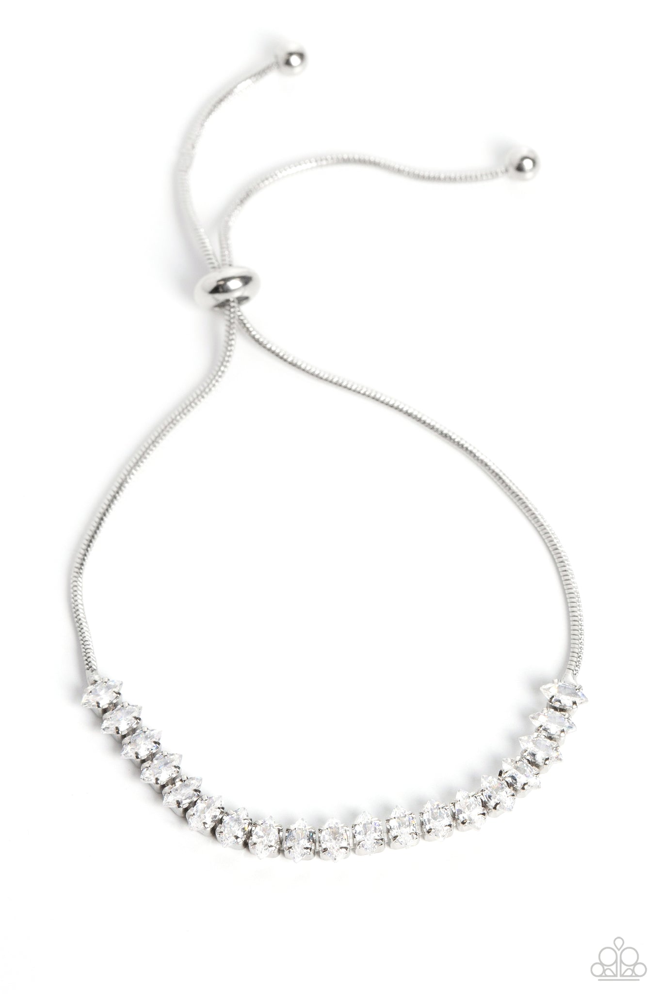 Strung along a dainty silver snake chain, a dainty collection of white, diamond-shaped rhinestones are pronged in place across the wrist for a subtle shimmer. Features an adjustable sliding knot closure.