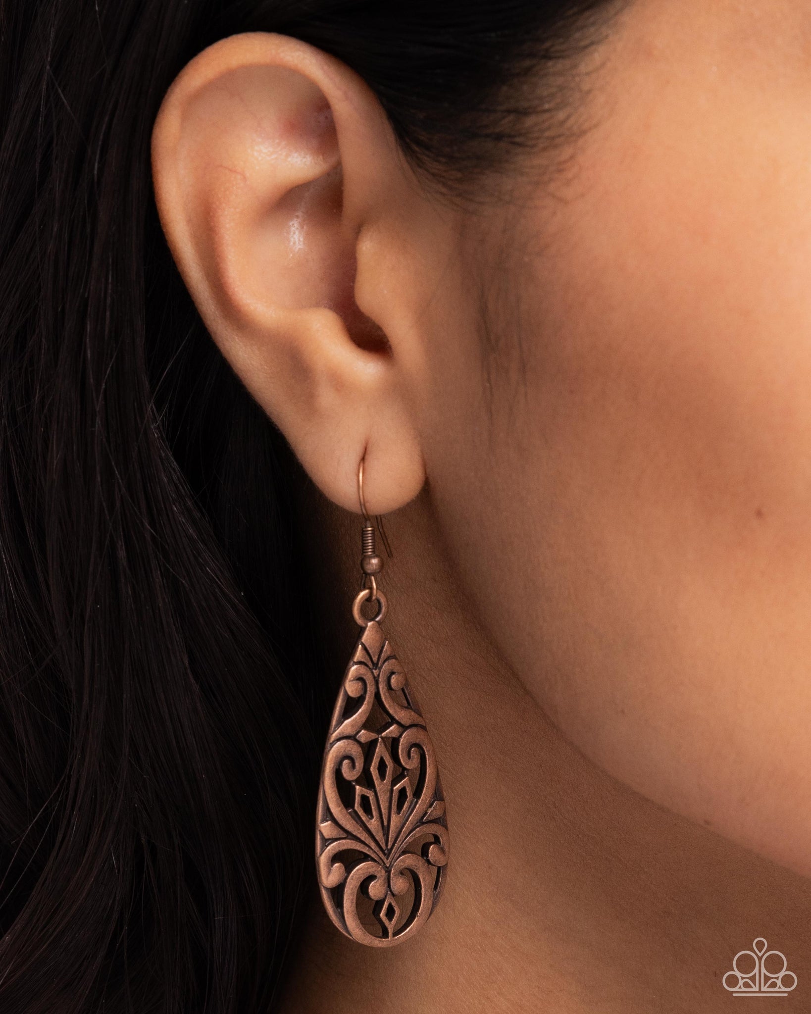 Brushed in a burnished finish, vine-like copper filigree climbs a copper teardrop frame for a regally rustic flair. Earring attaches to a standard fishhook fitting.