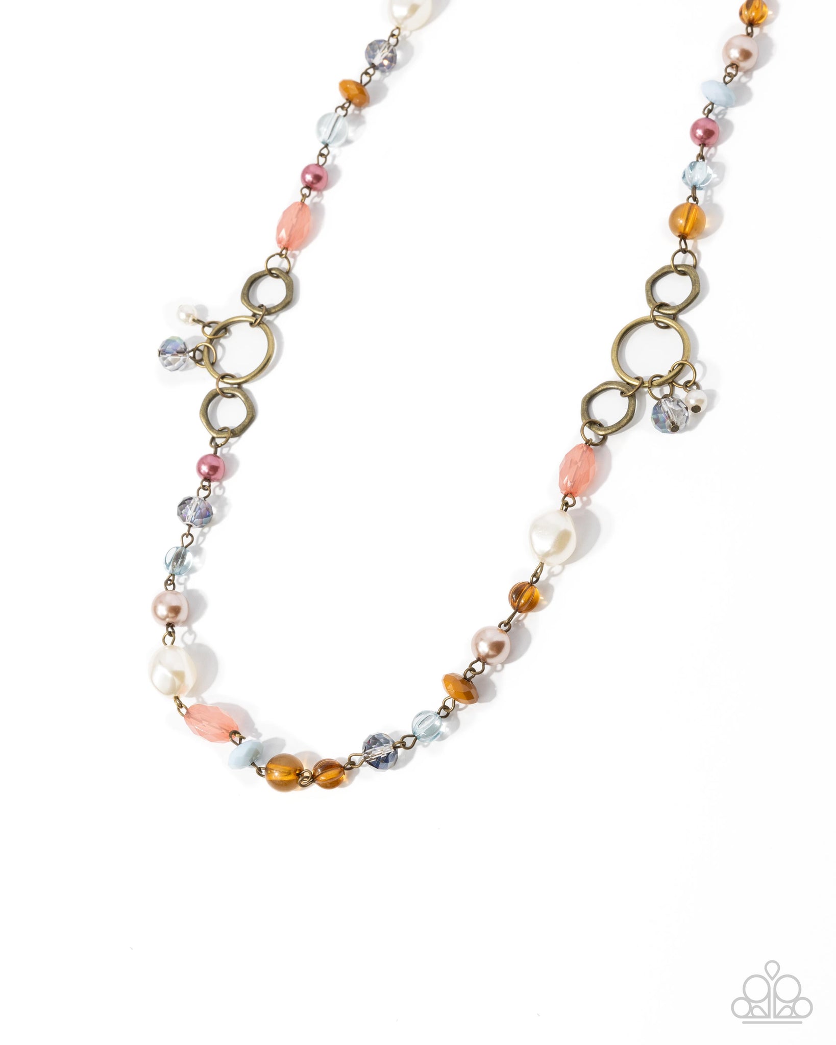 An assortment of beads in varying shapes, sizes, and colors—including Desert Rose, Buckthorn brown and pearl-like finishes—link together along an antiqued brass chain, adding a touch of whimsical charm. Circular brass accents create symmetrical intervals along the chest. Features an adjustable clasp closure.