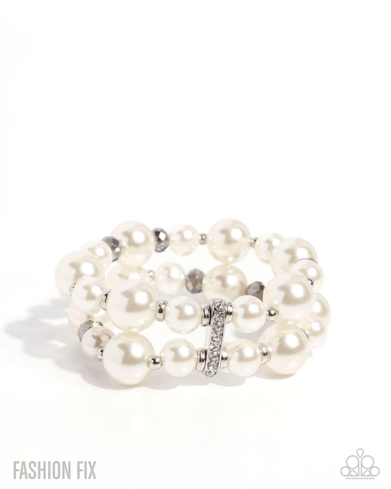 Infused along elastic stretchy bands, layers of glossy luxurious white pearls in varying sizes, faceted smoky and hematite beads, silver discs, and ornate white rhinestones in silver fittings pattern around the wrist for a refined mismatched flair.