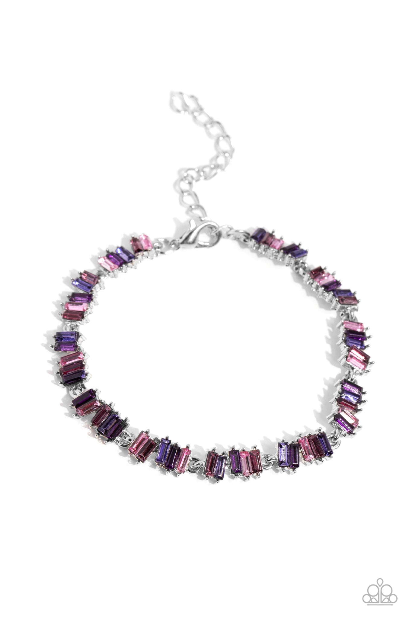 Featuring various shades of purple, emerald-cut gems set in silver-pronged fittings dance along the wrist in clusters for a dizzying display. Features an adjustable clasp closure.
